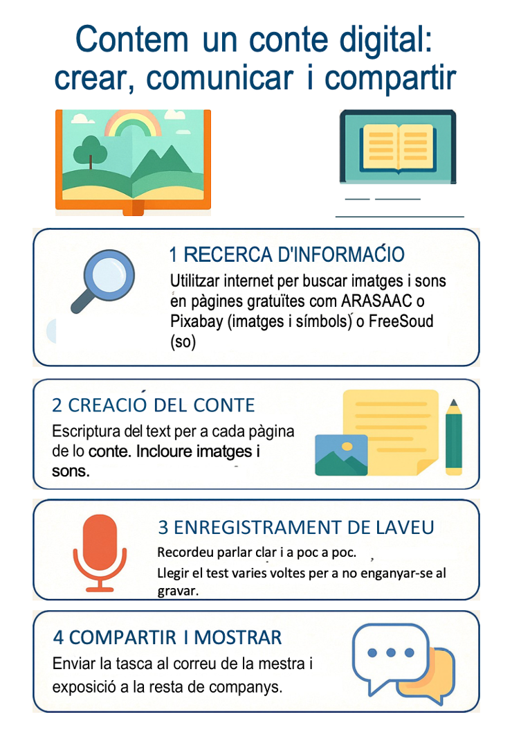 Per grups heu de crear un conte en Power Point o Book Create. El conte ha d'estar escrit, amb dibuixos explicatius i àudios. Consulteu la infografia per a seguir els passos a poc a poc.