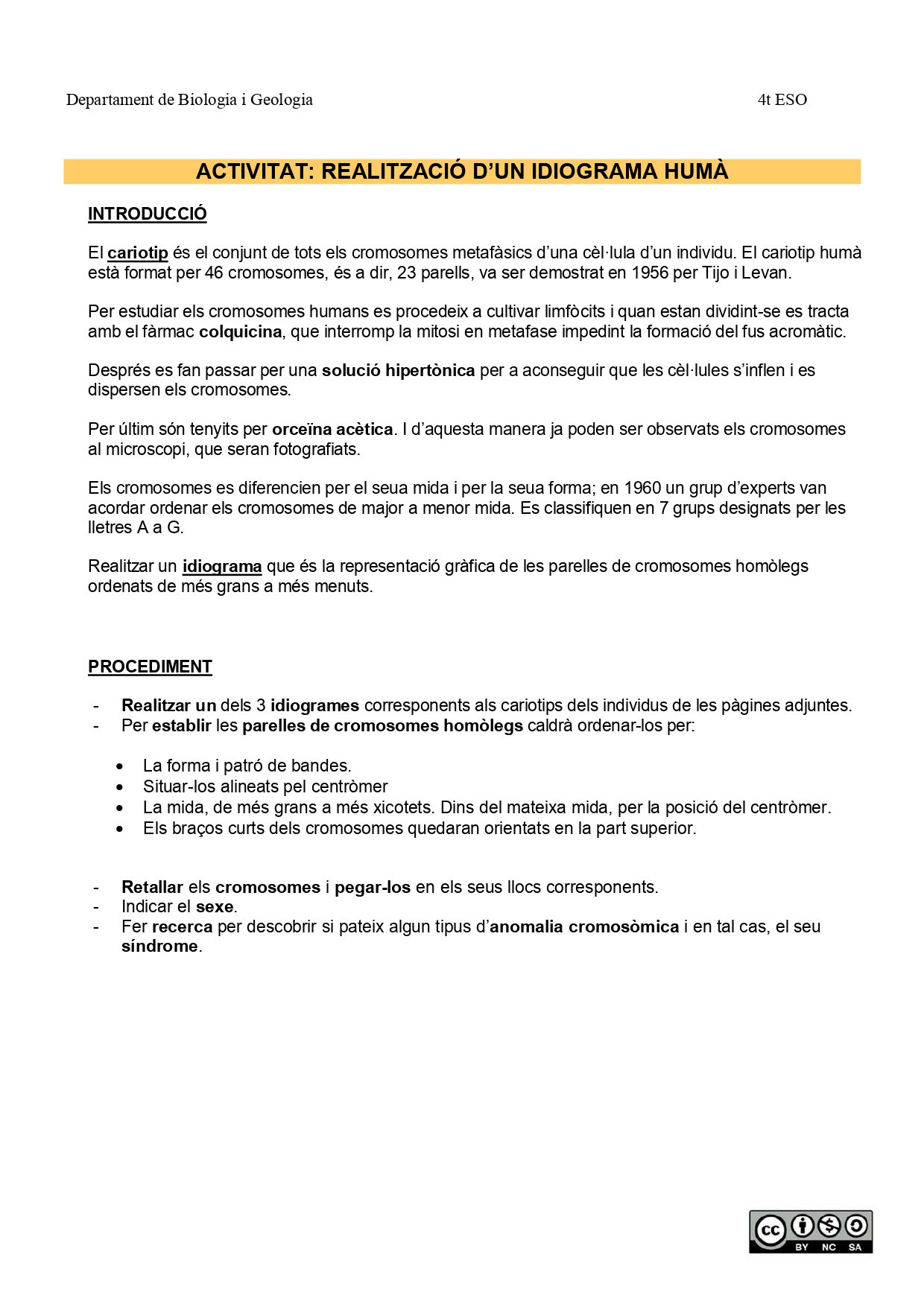 L'alumnat, en aquest cas, de quart d'ESO ha de desenvolupar la capacitat d'observació, anàlisi i interpretació d'un idiograma a partir d'un cariotip per identificar característiques com el nombre, la forma i la mida dels cromosomes. Servirà com a suport visual i pràctic per facilitar la comprensió del contingut relacionat amb la genètica i les anomalies genètiques.