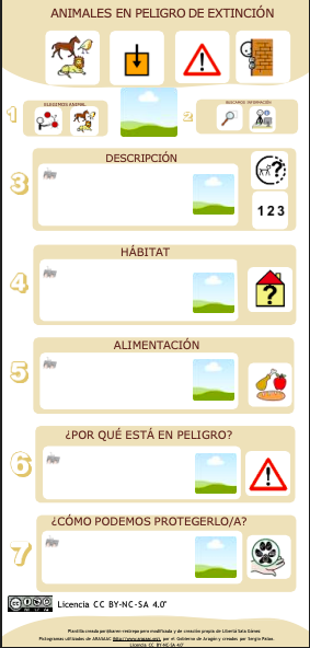 Este recurso educativo propone una actividad de investigación guiada sobre los animales en peligro de extinción, adaptada mediante apoyos visuales, plantillas estructuradas y pictogramas. El alumnado, en grupo, elige un animal y recopila información sobre su descripción, hábitat, alimentación, causas de su peligro y formas de protección. La tarea promueve la conciencia medioambiental, el trabajo cooperativo y el desarrollo del lenguaje escrito y oral a través de una metodología activa y accesible. Está especialmente diseñada para alumnado de Educación Primaria con necesidades específicas de apoyo educativo (NEAE), incluyendo apoyos visuales de ARASAAC para facilitar la comprensión y la participación de todo el grupo.