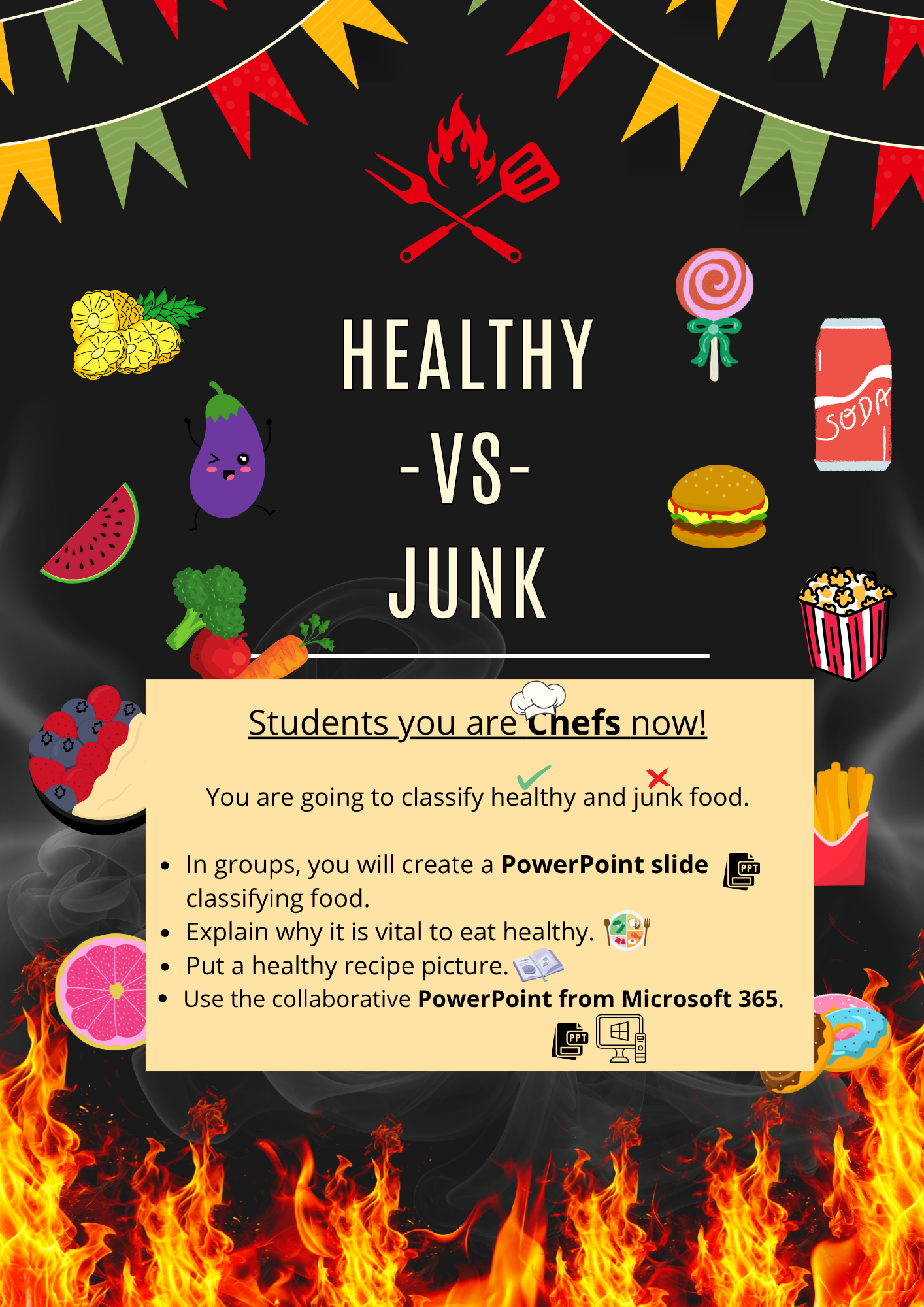 El póster presenta una actividad cooperativa titulada “Healthy vs Junk Food”, en la que los estudiantes se convierten en chefs. Su misión es clasificar alimentos saludables y comida basura, crear una diapositiva de PowerPoint en grupo, explicar la importancia de comer sano y añadir la imagen de una receta saludable.