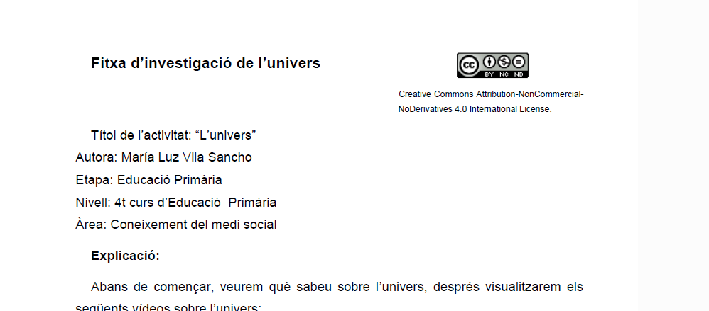 Aquesta activitat, titulada “L’univers”, està pensada per a alumnat de 4t de Primària dins de l’àrea de Coneixement del medi social. Consisteix en una investigació cooperativa sobre la formació i els components de l’univers. Els alumnes es divideixen en grups i cadascun investiga un tema concret (formació de l’univers, sistema solar, planetes, satèl·lits, estrelles, etc.). El treball es desenvolupa en diverses sessions: Primer, es visualitzen vídeos explicatius sobre el tema. Després, cada grup cerca informació a internet i elabora un resum escrit. Finalment, es prepara una presentació (PowerPoint, mural, lapbook o maqueta) per exposar els resultats davant la classe. L’activitat fomenta la recerca autònoma, el treball en equip i la comunicació oral, alhora que permet comprendre millor com és i com s’ha format l’univers.