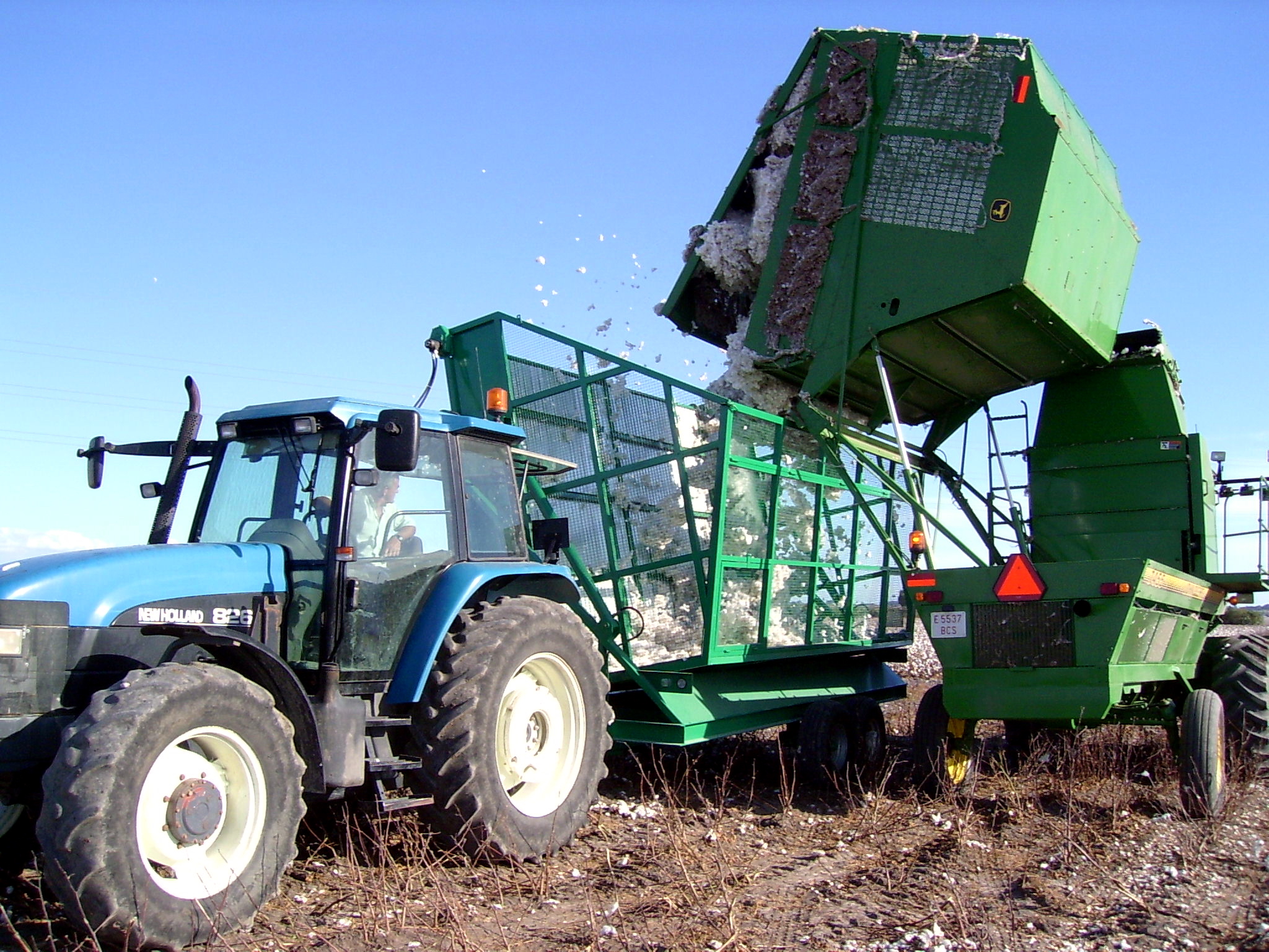 Cosechadora volcando algodón sobre un tractor