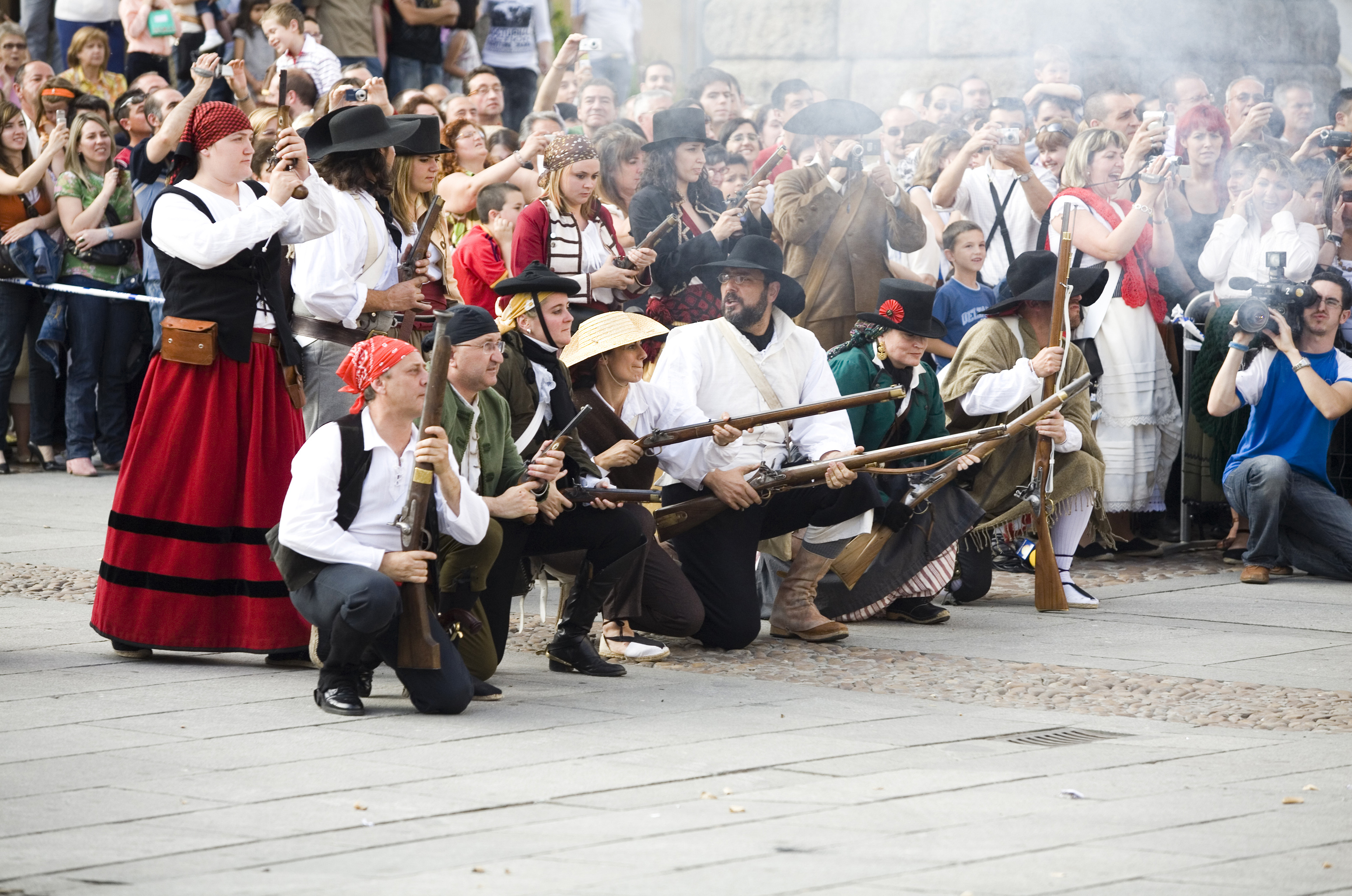 Recreación de la Guerra de la Independencia en Segovia: Turistas en una demostración de disparos de civiles organizados militarmente junto al Acueducto de Segovia