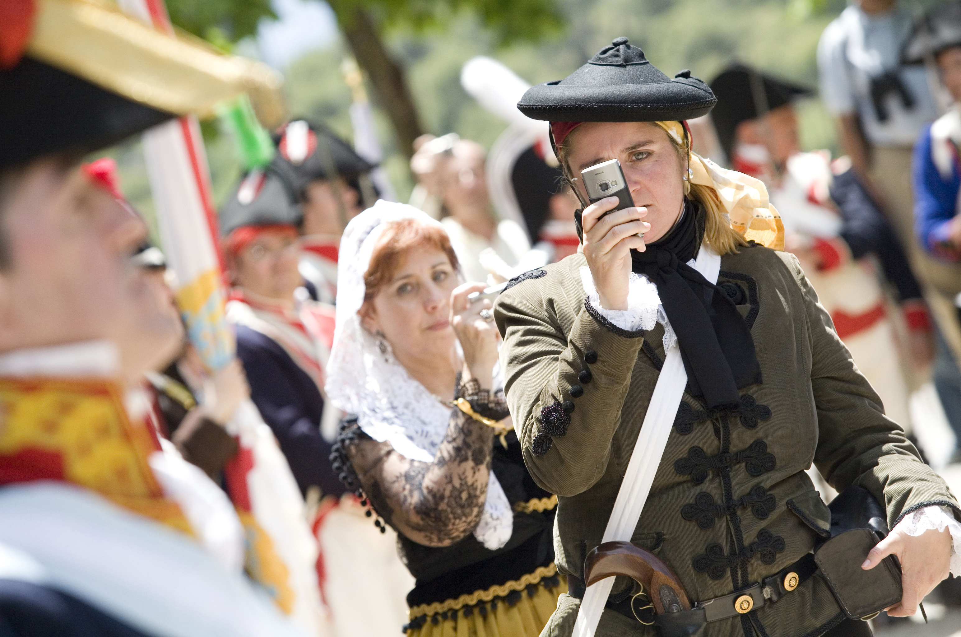Recreación de la Guerra de la Independencia en Segovia: Mujer figurante de la recreación haciendo fotos con un teléfono móvil