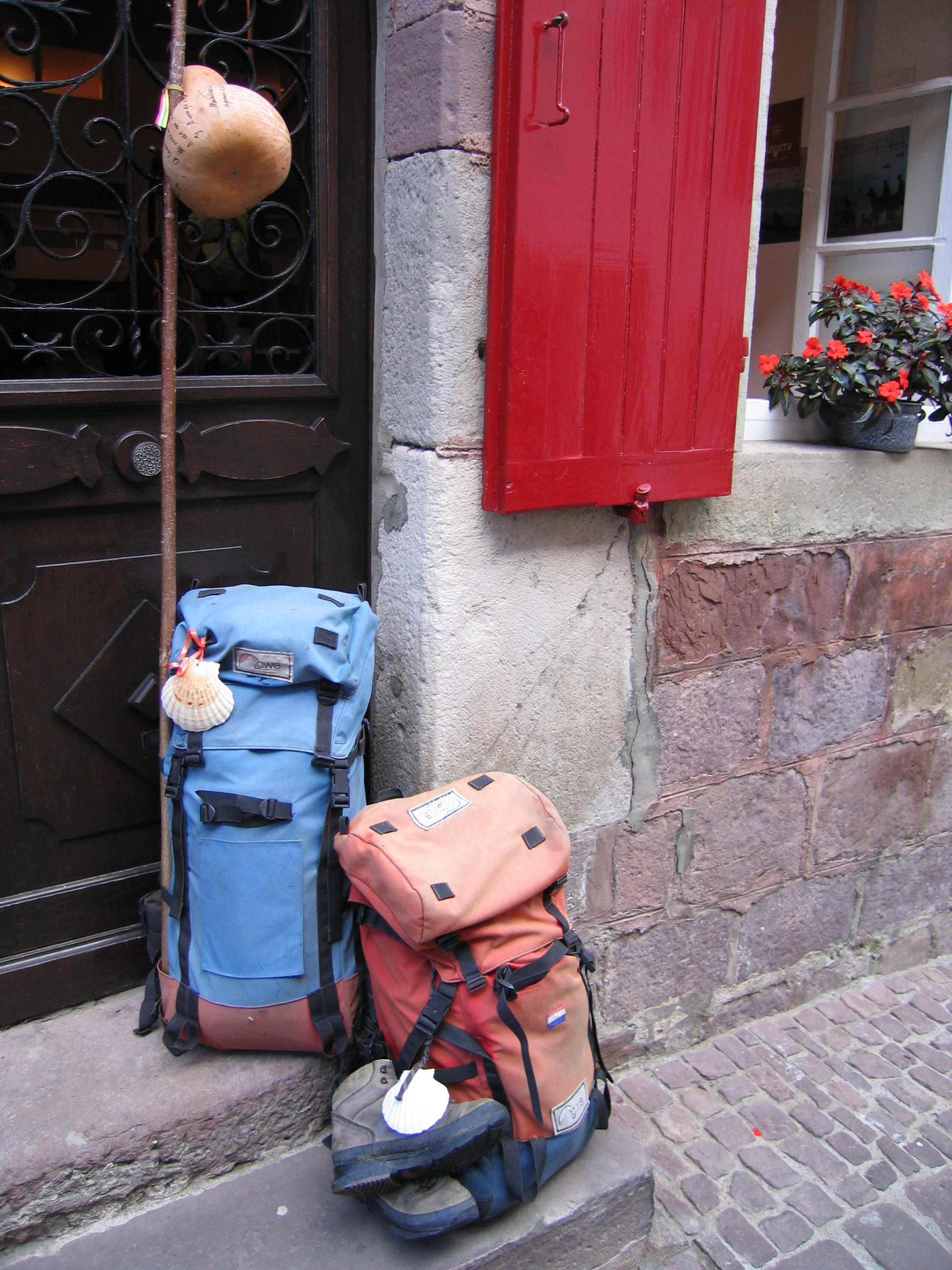 Mochilas de peregrinos del Camino de Santiago a la puerta de una casa en Saint-Jean-Pied-de-Port, Francia