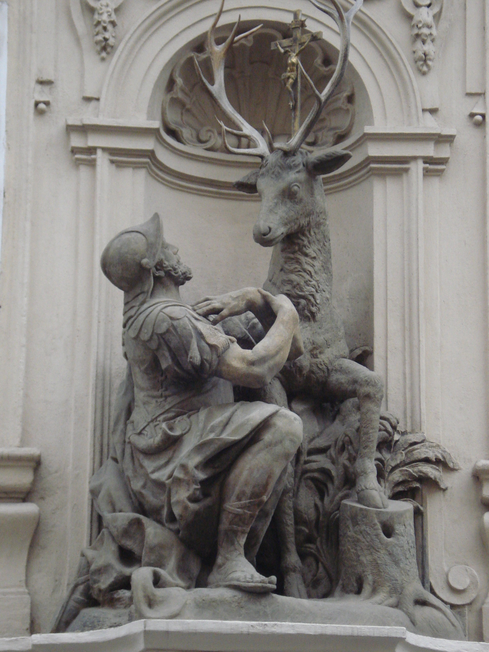 Detalle de la fachada de la casa del Venado Dorado en la calle Tomasská de Praga, República Checa