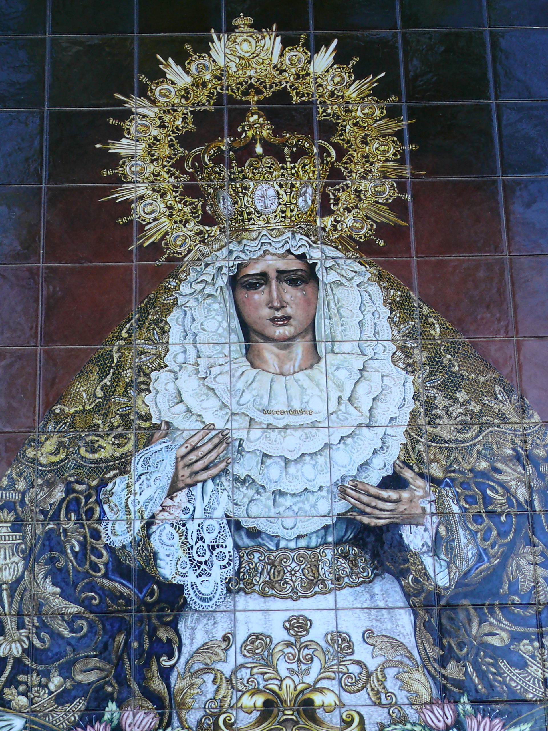 Azulejos decorados con la imagen de una Virgen Dolorosa en la Plaza de San Lorenzo, Sevilla
