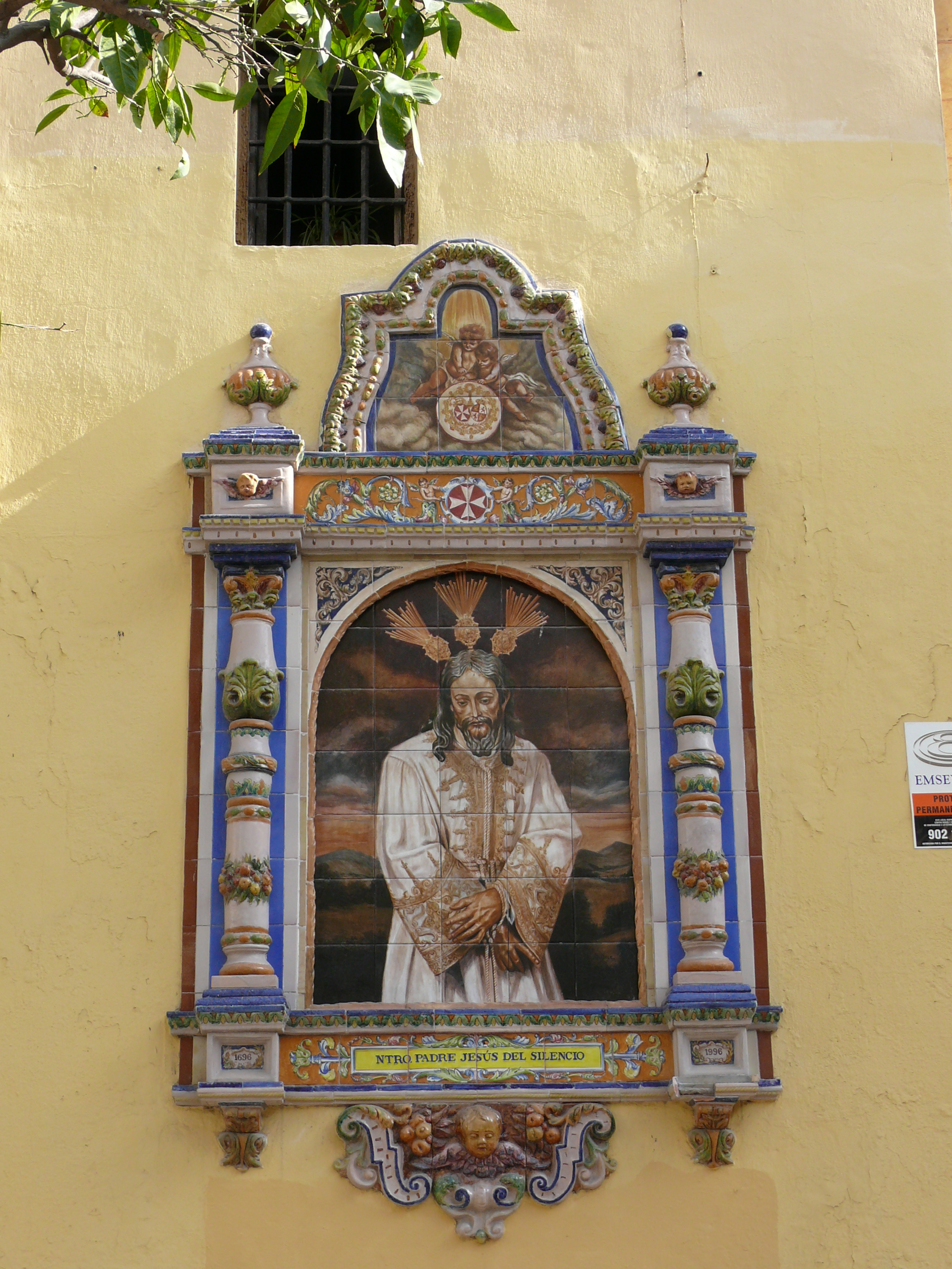 Azulejos pintados con la imagen del Cristo del Silencio en la fachada de la Iglesia de San Juan de la Palma, Sevilla