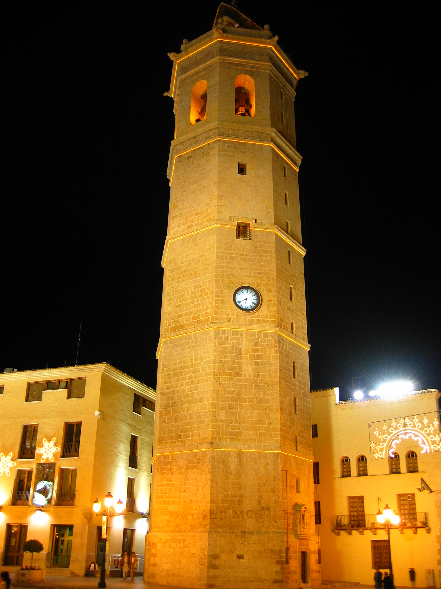 Vista nocturna de El Fadrí, en la plaza del ayuntamiento, Castellón