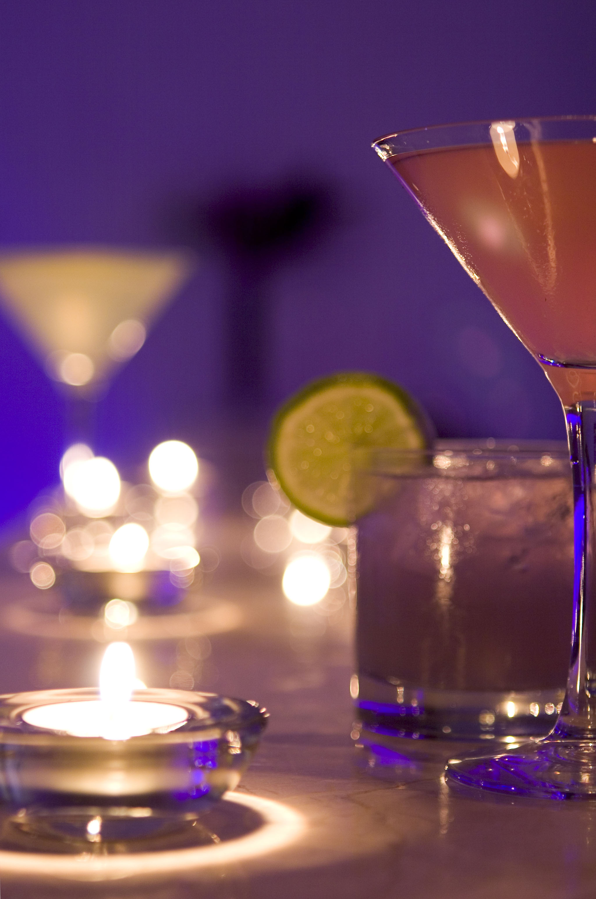 Velas que adornan la barra de un bar junto a una copa y un vaso de bebida