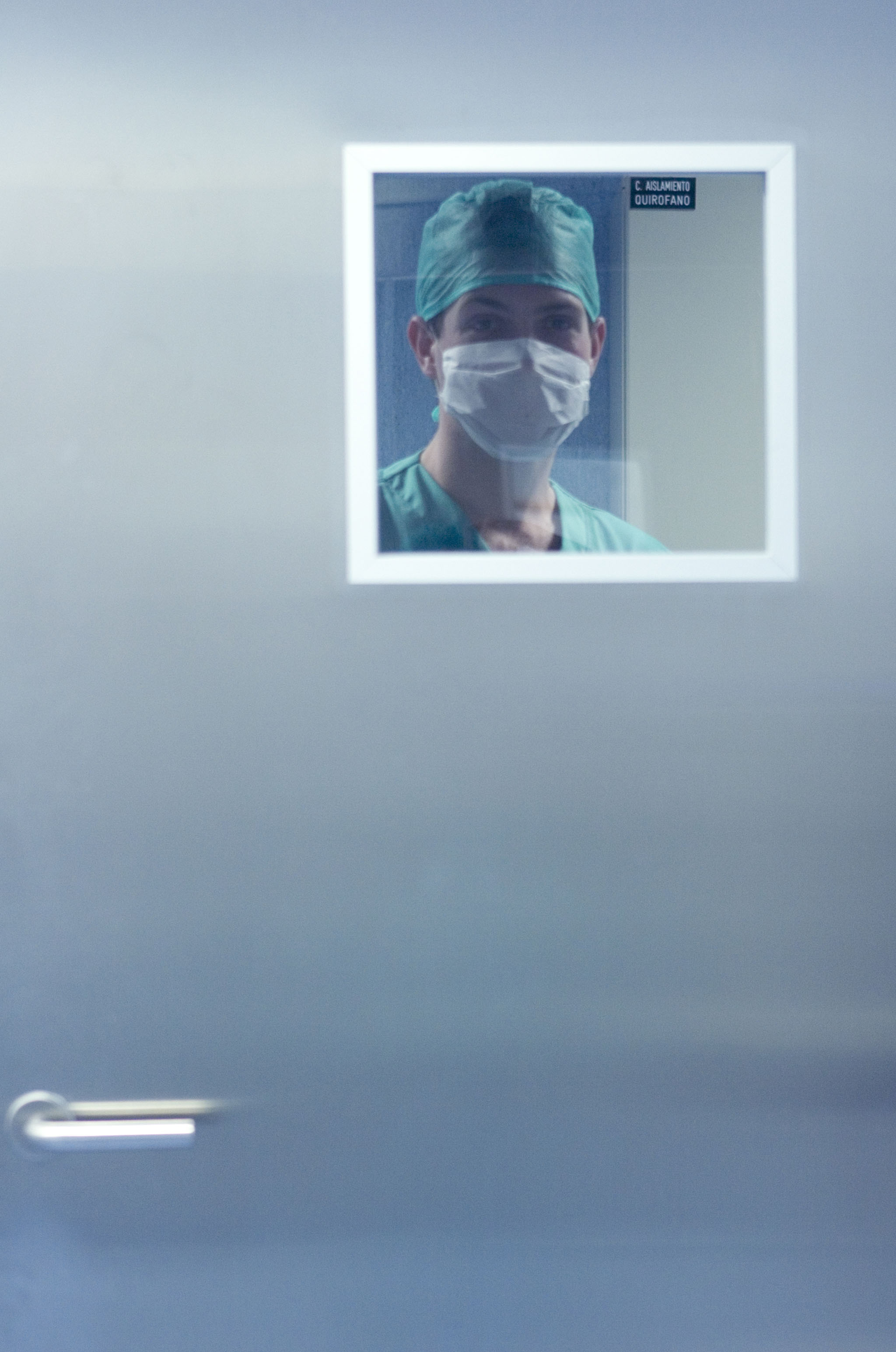 Un médico con mascarilla mirando por la ventana de la puerta de un quirófano