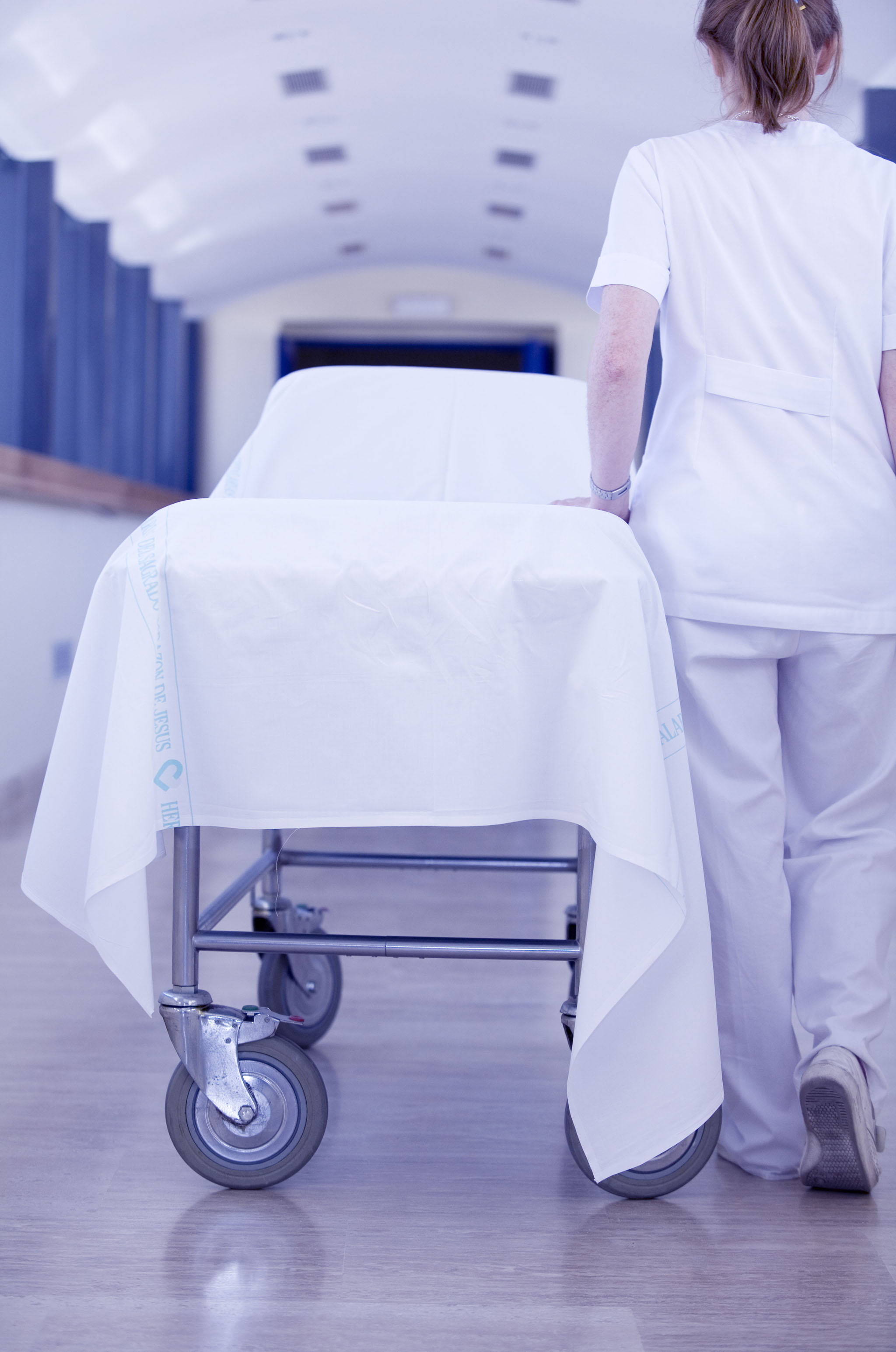 Enfermera de espaldas empujando una camilla vacía por el pasillo de un hospital