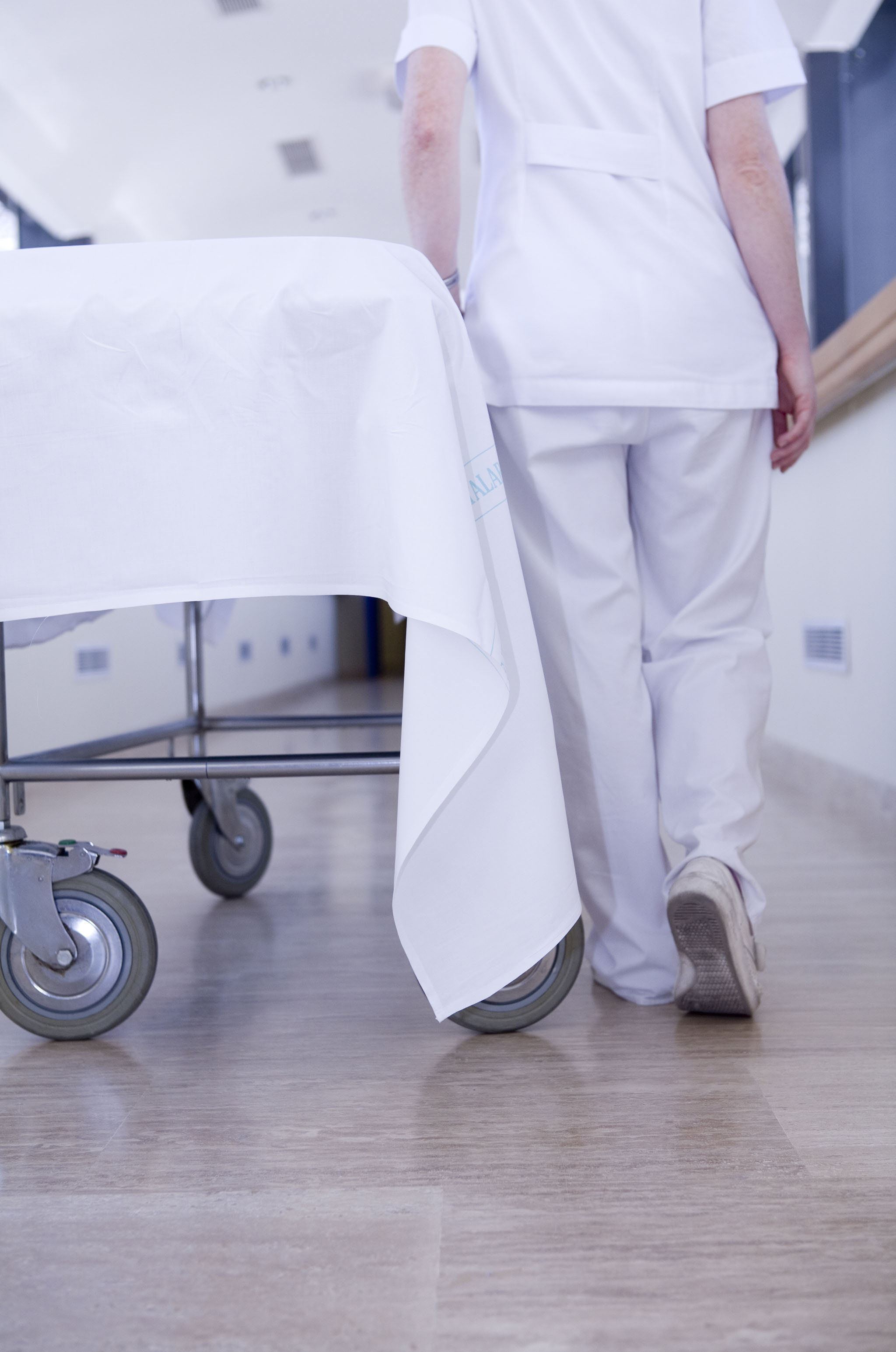 Enfermera de espaldas empujando una camilla vacía por el pasillo de un hospital