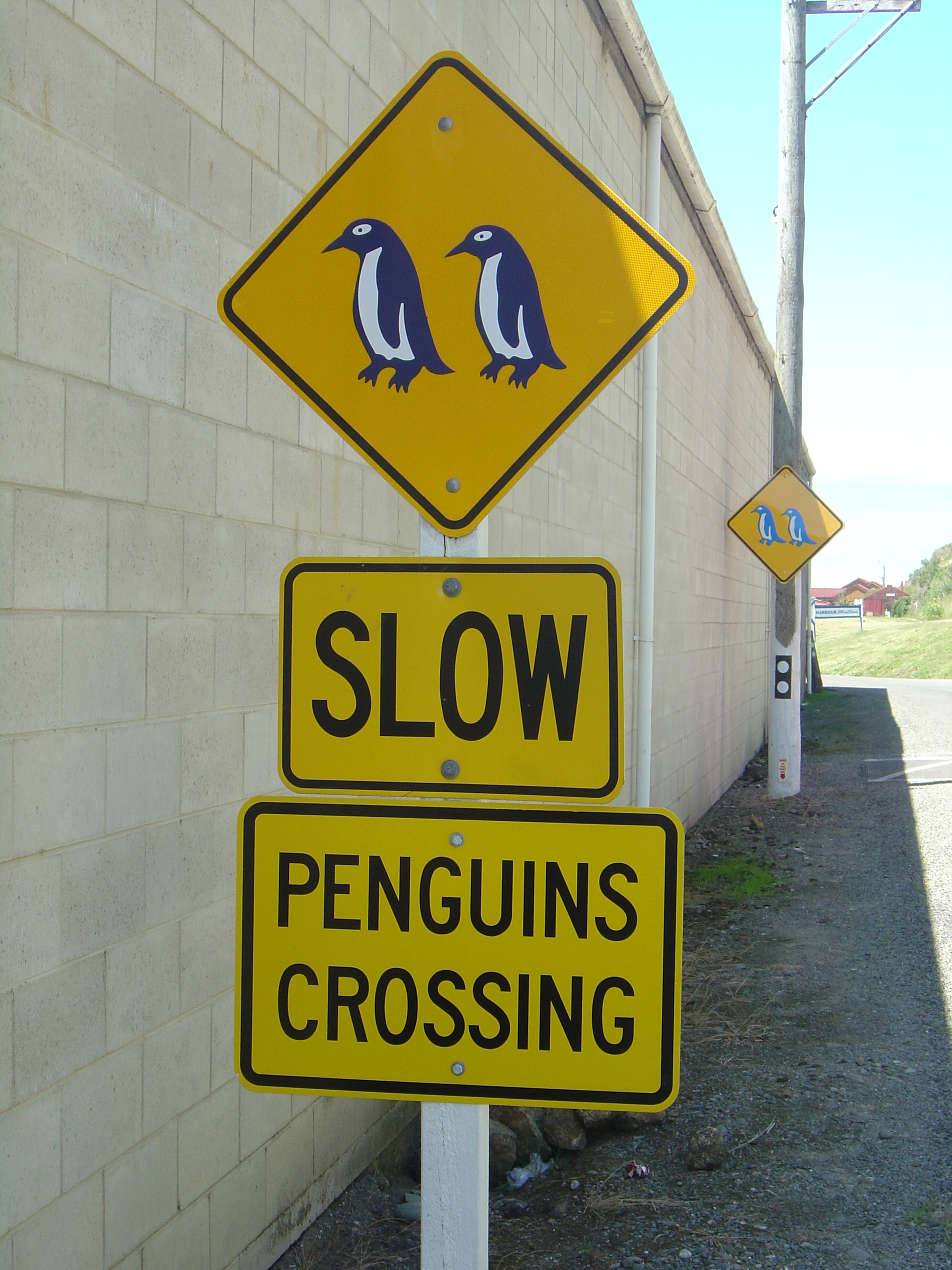 Señal de tráfico indicando precaución por pingüinos, Nueva Zelanda