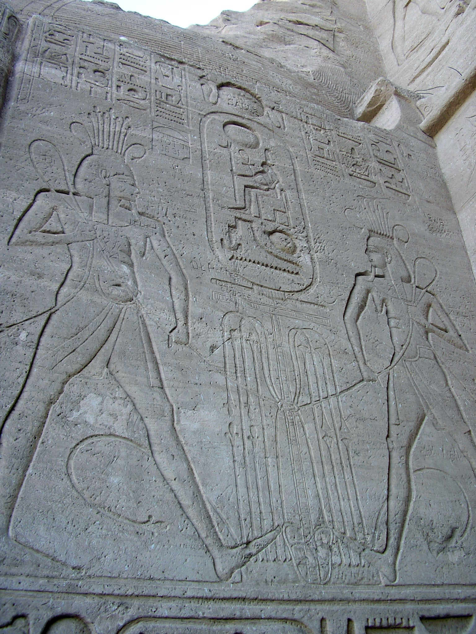 Relieves bajo la escultura gigantesca de Ramses II en Abu Simbel, Egipto