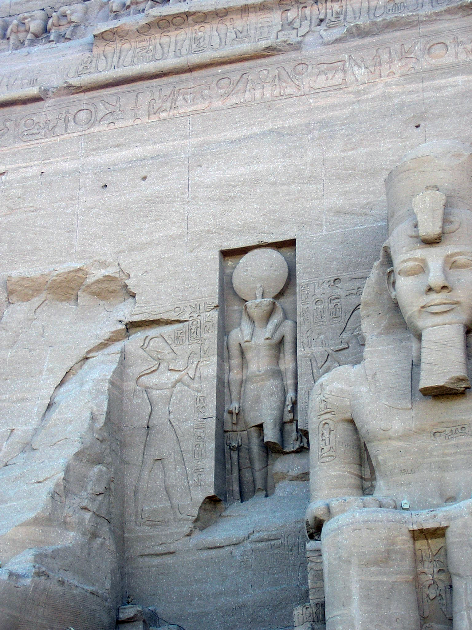 Detalle en el centro de la pared de entrada al templo de Abu Simbel, Egipto