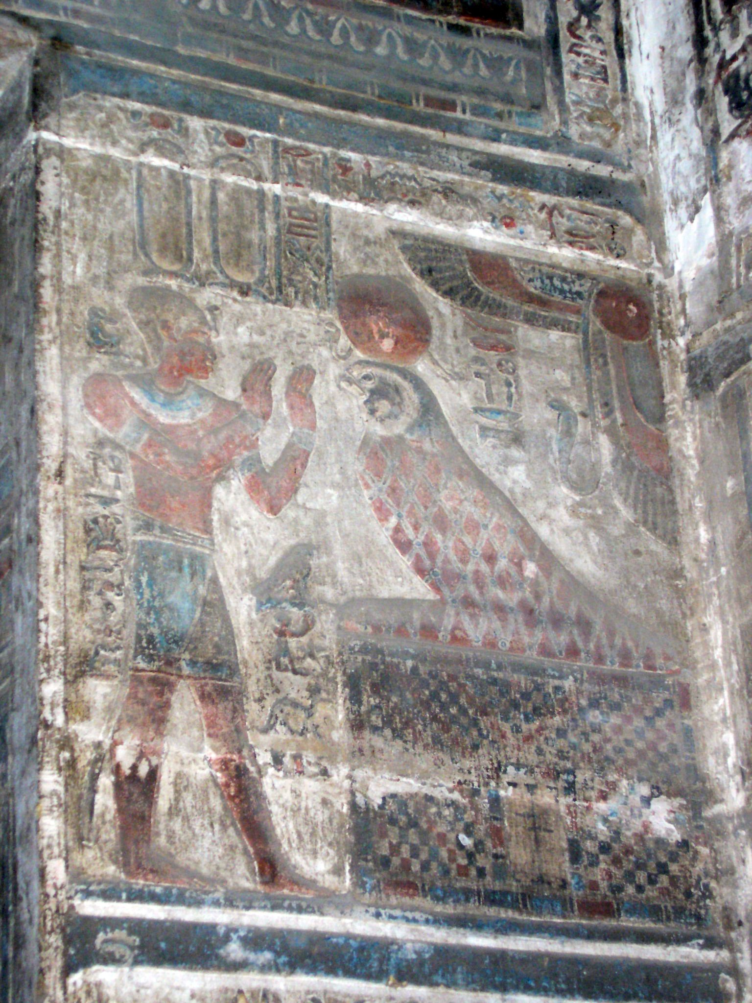 Escena policromada donde el faraón esta reverenciando al dios Horus en una de las estancias del Templo de Dendera, Egipto