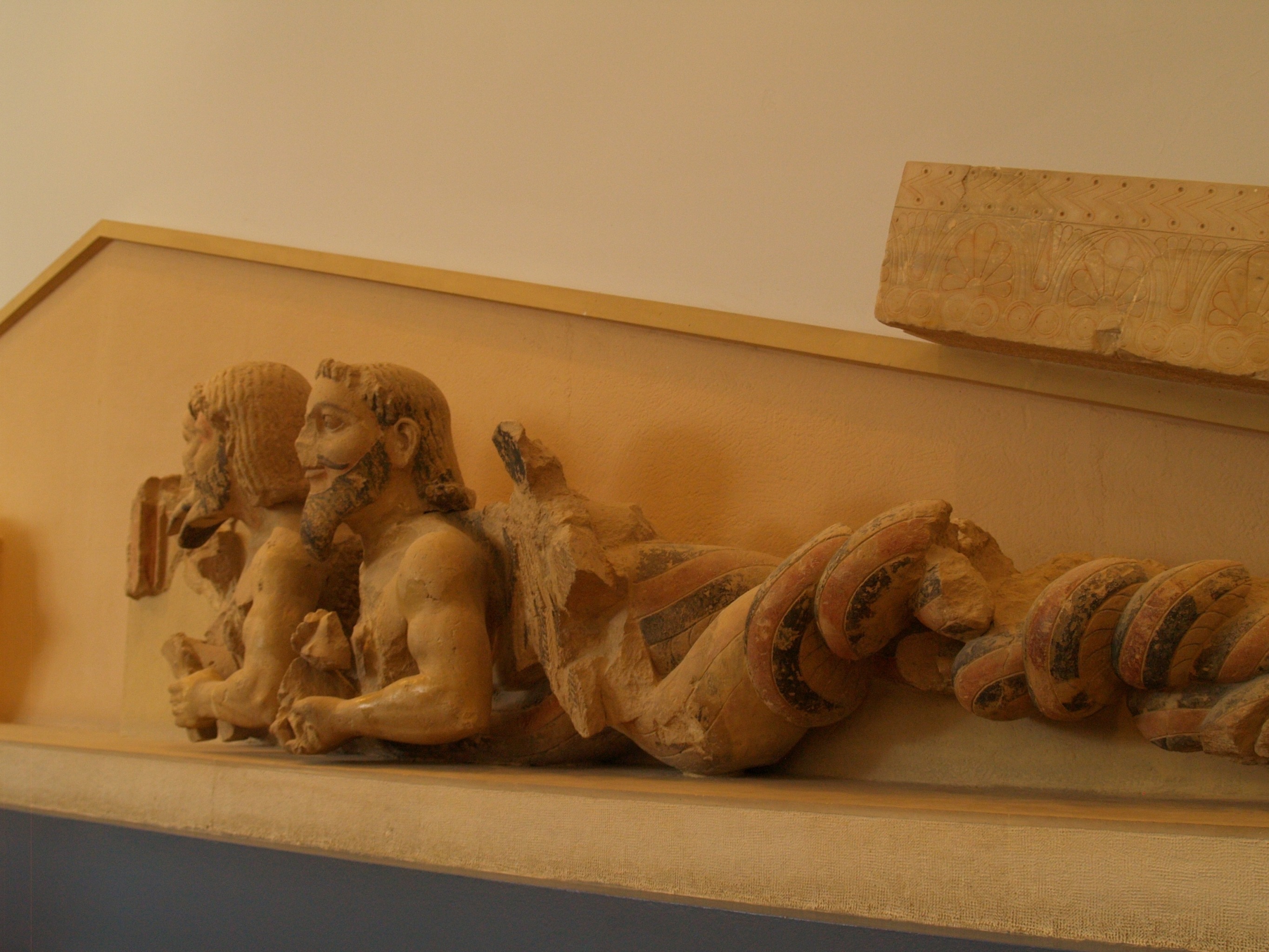 Detalle de frontón arcaico con tres cabezas de un demonio, Museo de la Acrópolis, Atenas, Grecia