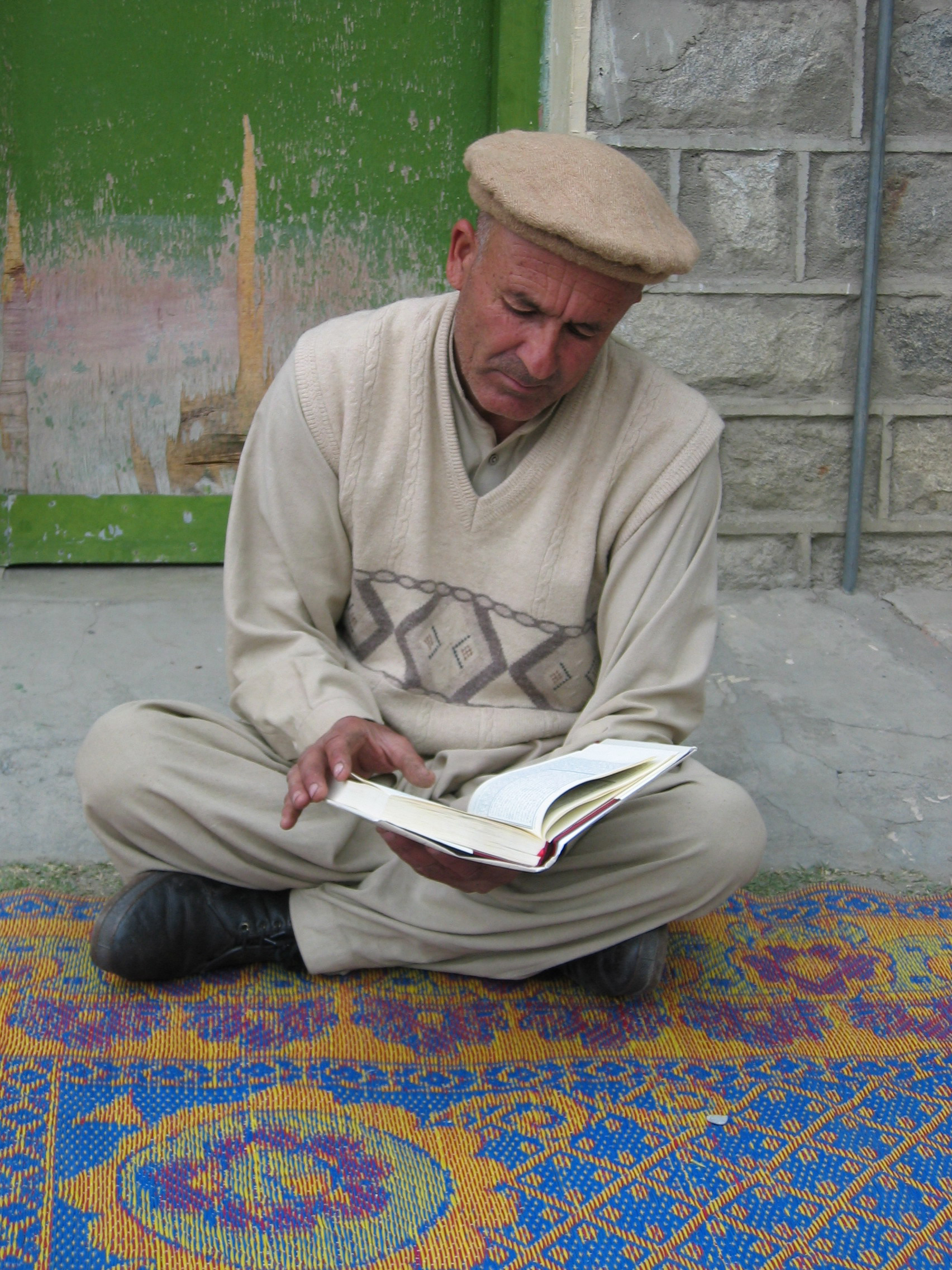Hombre Hunzakut leyendo el Corán, valle del Hunza, Pakistán