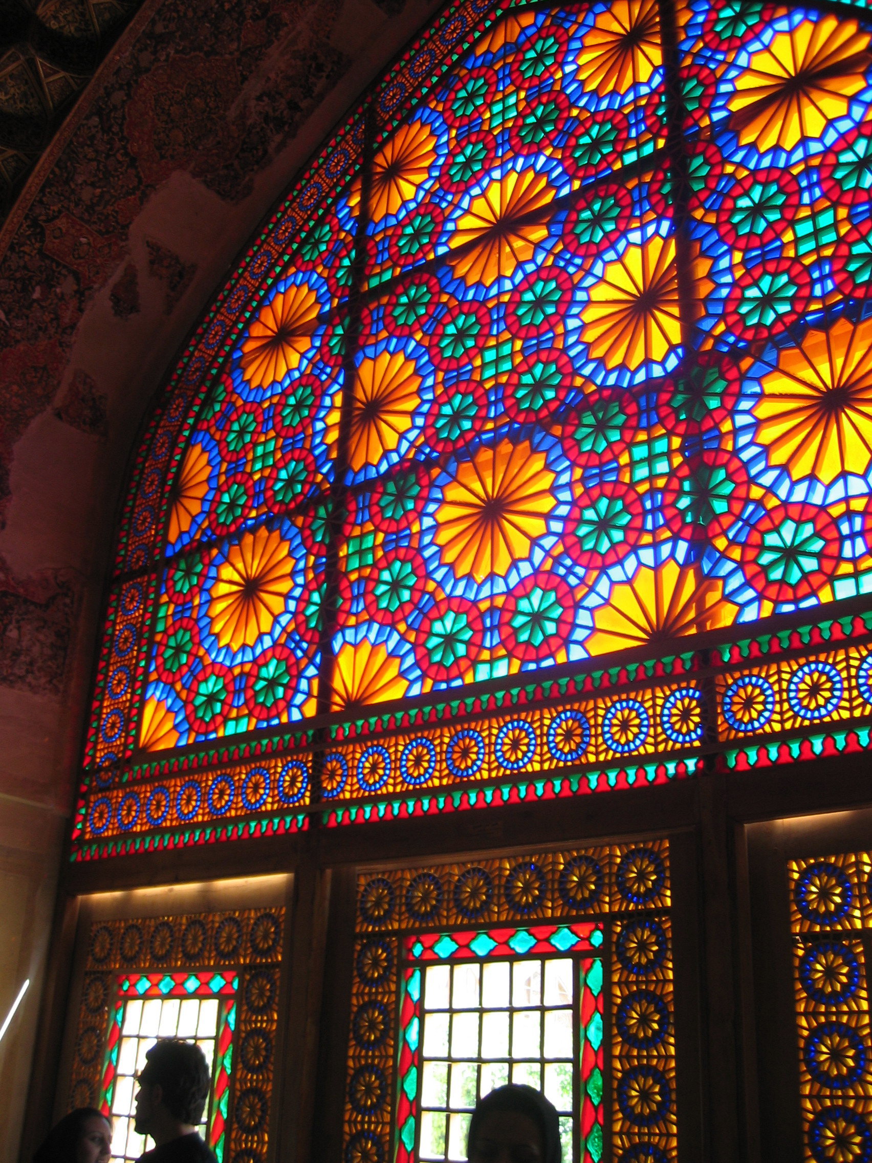 Decoración con cristales tintados en la Fortaleza de Arg-e Karim Khan, Shiraz, Irán