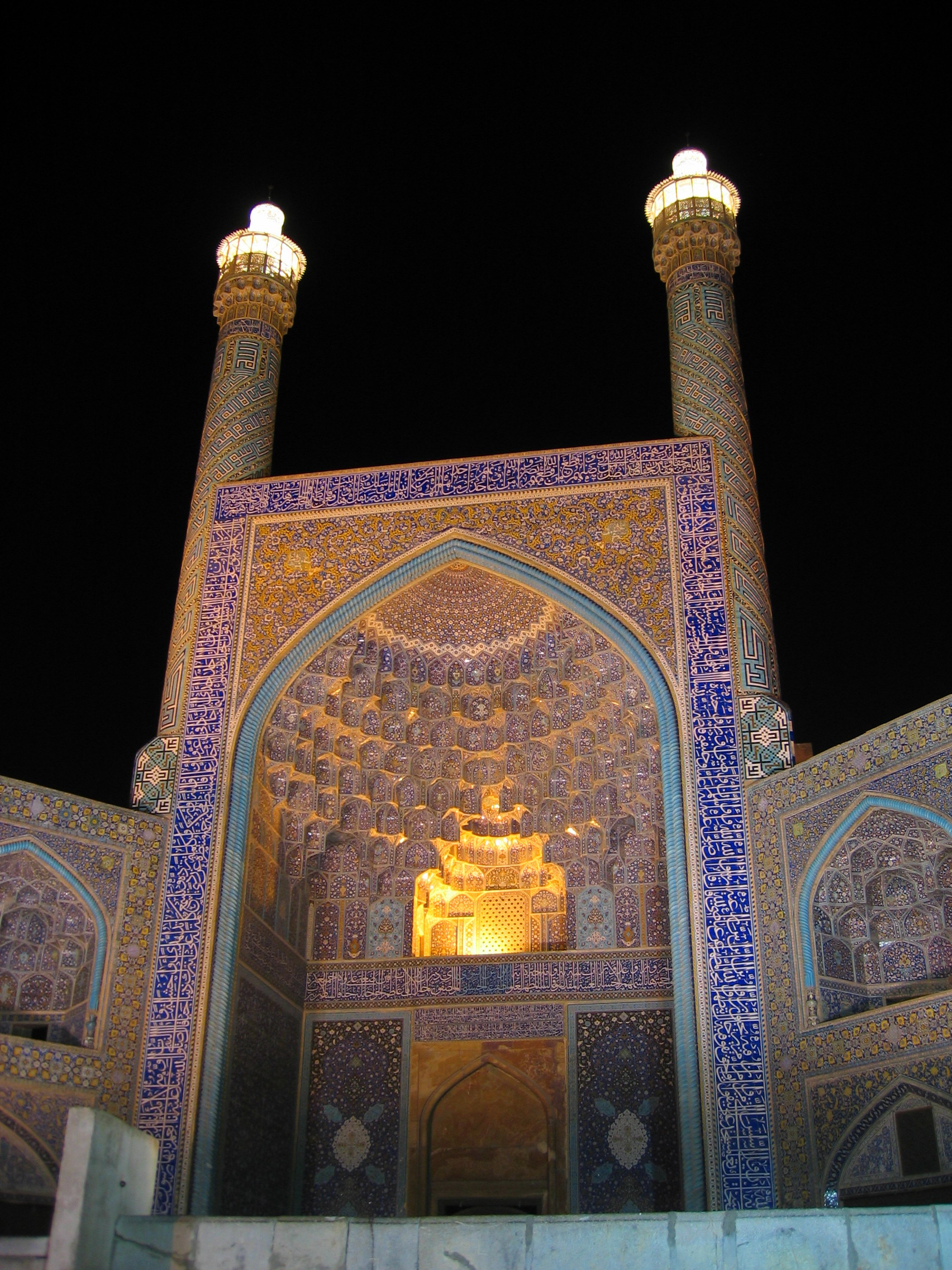Vista nocturna de la fachada principal de la mezquita del Imam, Isfahán, Irán