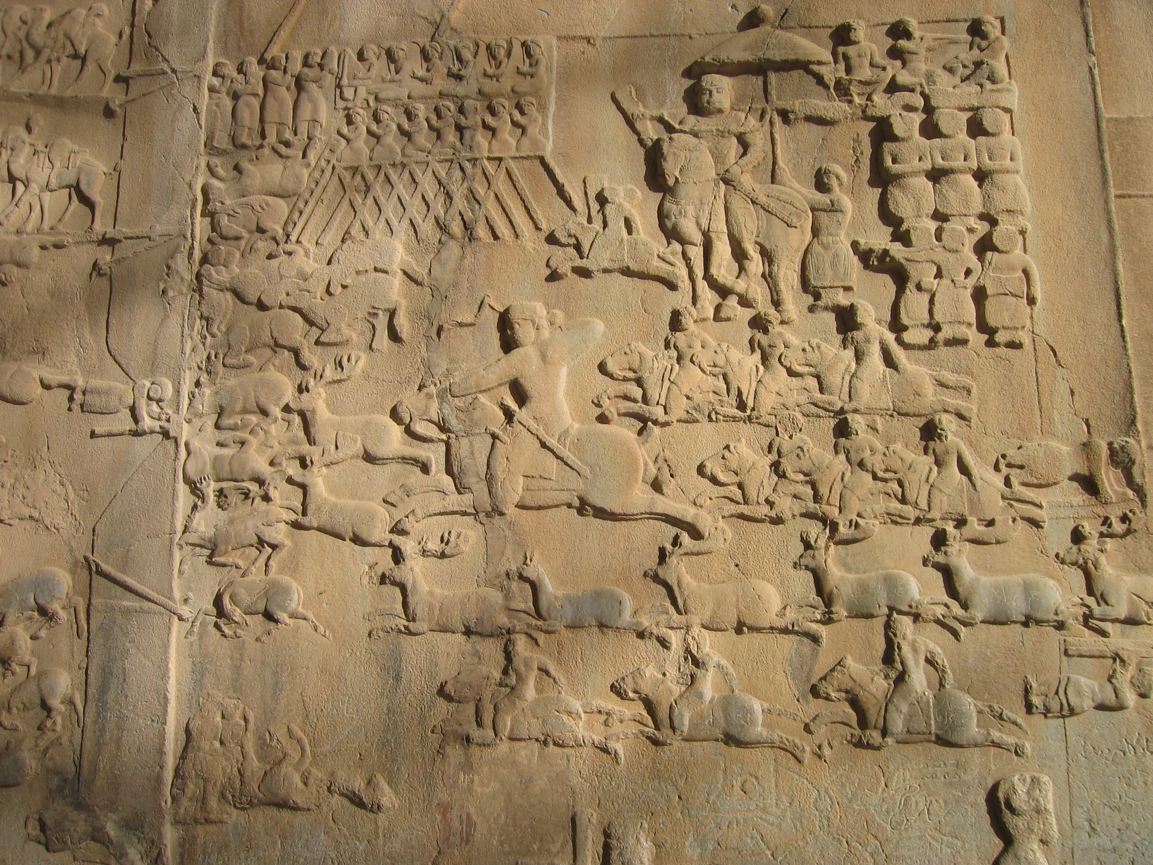 Relieve con escena de cacería en Taq-e Bostan, Kermanshah, Irán