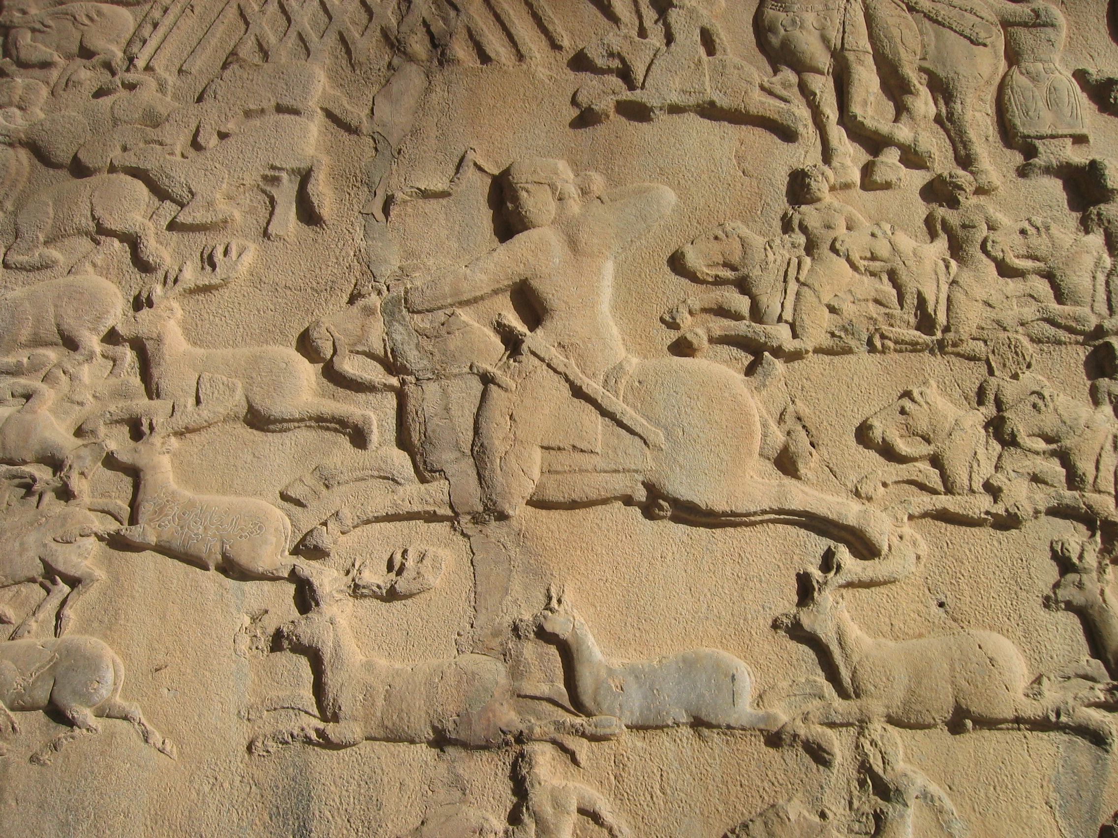 Detalle de relieve con escena de cacería en Taq-e Bostan, Kermanshah, Irán