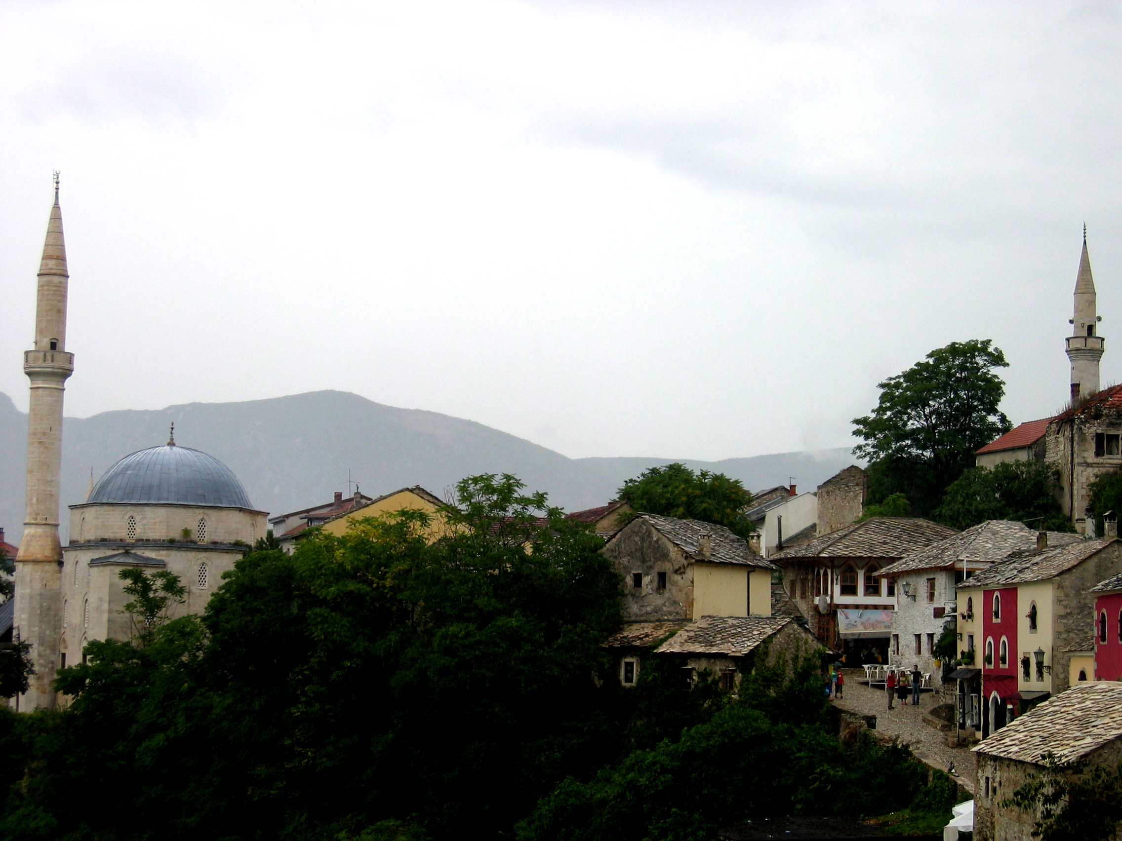 Vista general de la ciudad vieja y minaretes, Mostar, Bosnia-Herzegovina