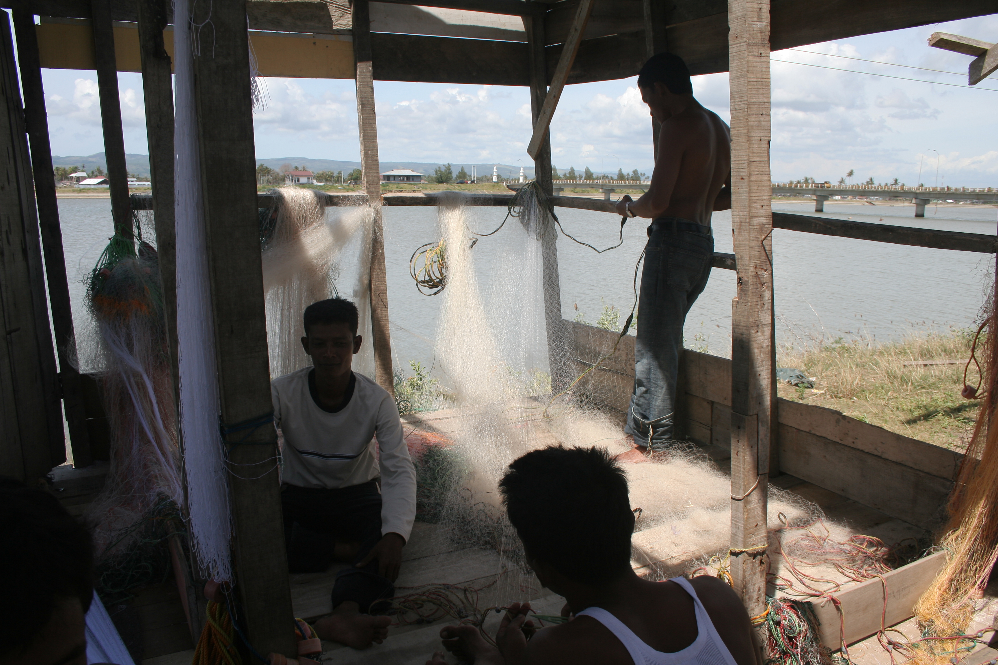Arreglando redes del campamento de pescado de Alunaga, Sumatra, Indonesia