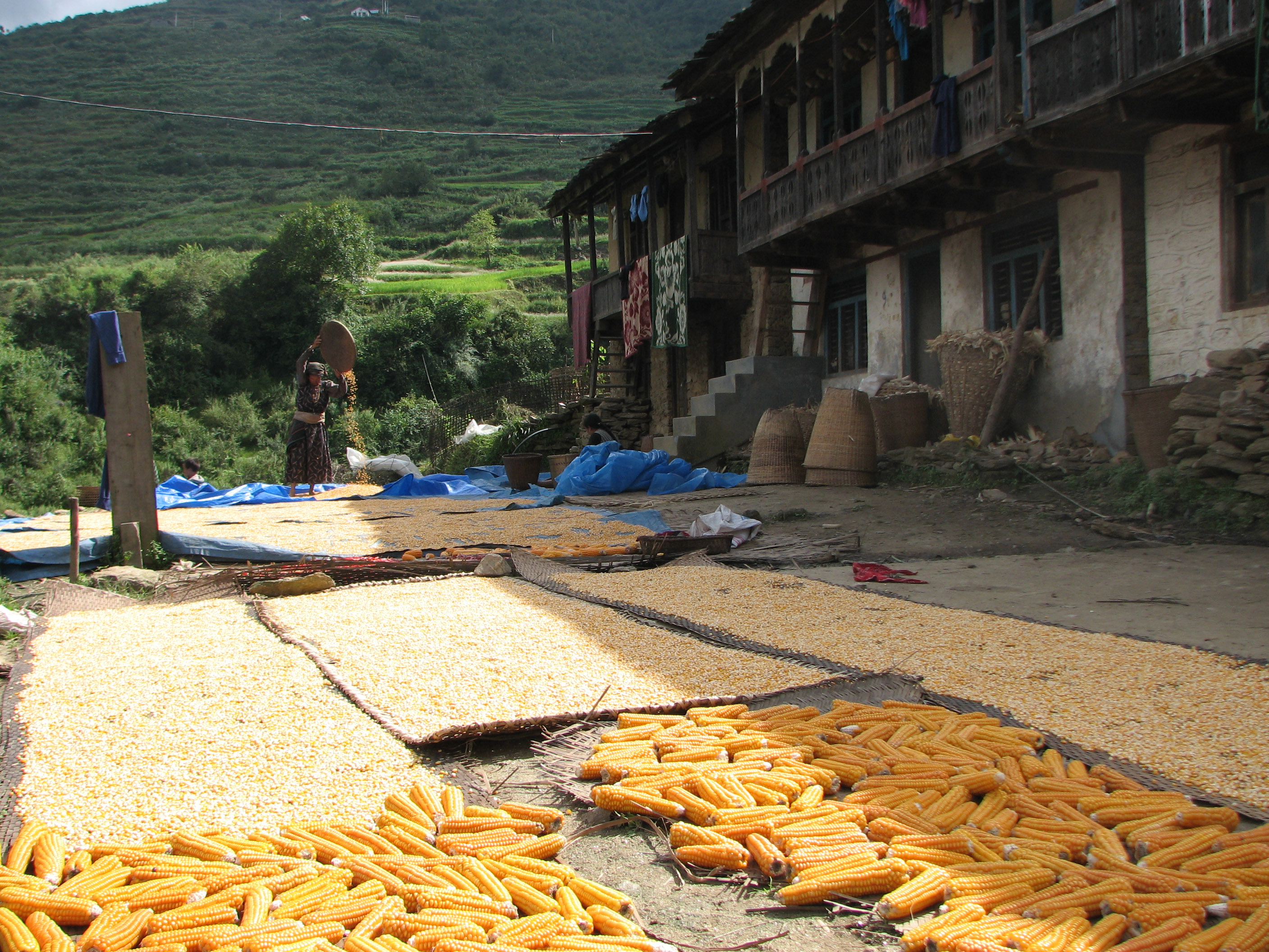 Maíz puesto a secar al sol en Syabru, Langtang, Nepal