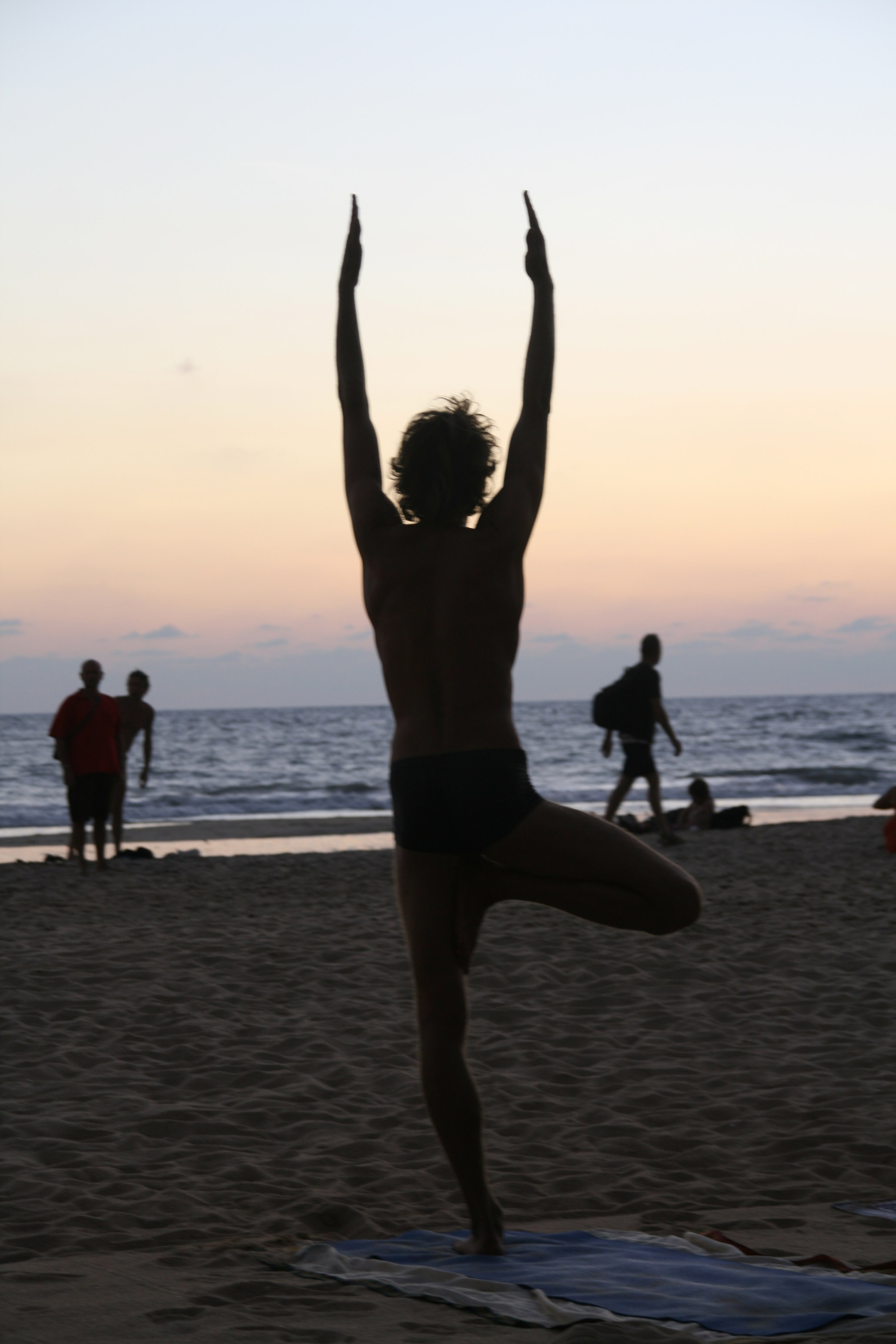 Hombre haciendo yoga en la playa de Varkala, Kerala, India