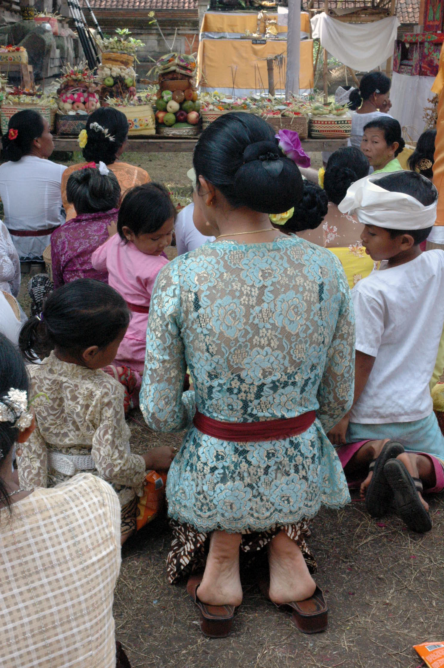 Mujeres y ofrendas para la cermonia funeraria hindú, Bali, Indonesia