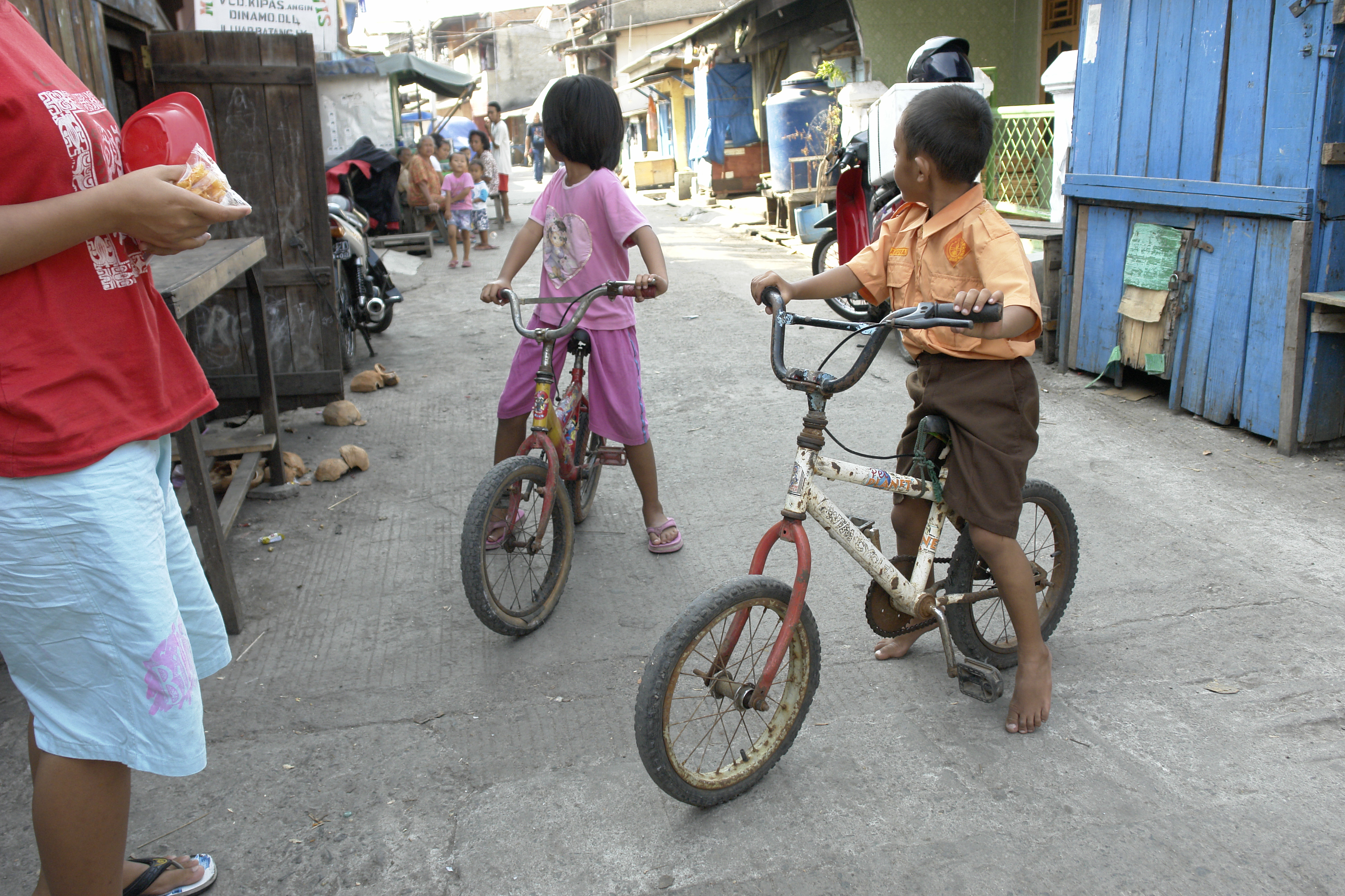 Niños en bicicleta en Sunda Kelapa, Yakarta, Indonesia
