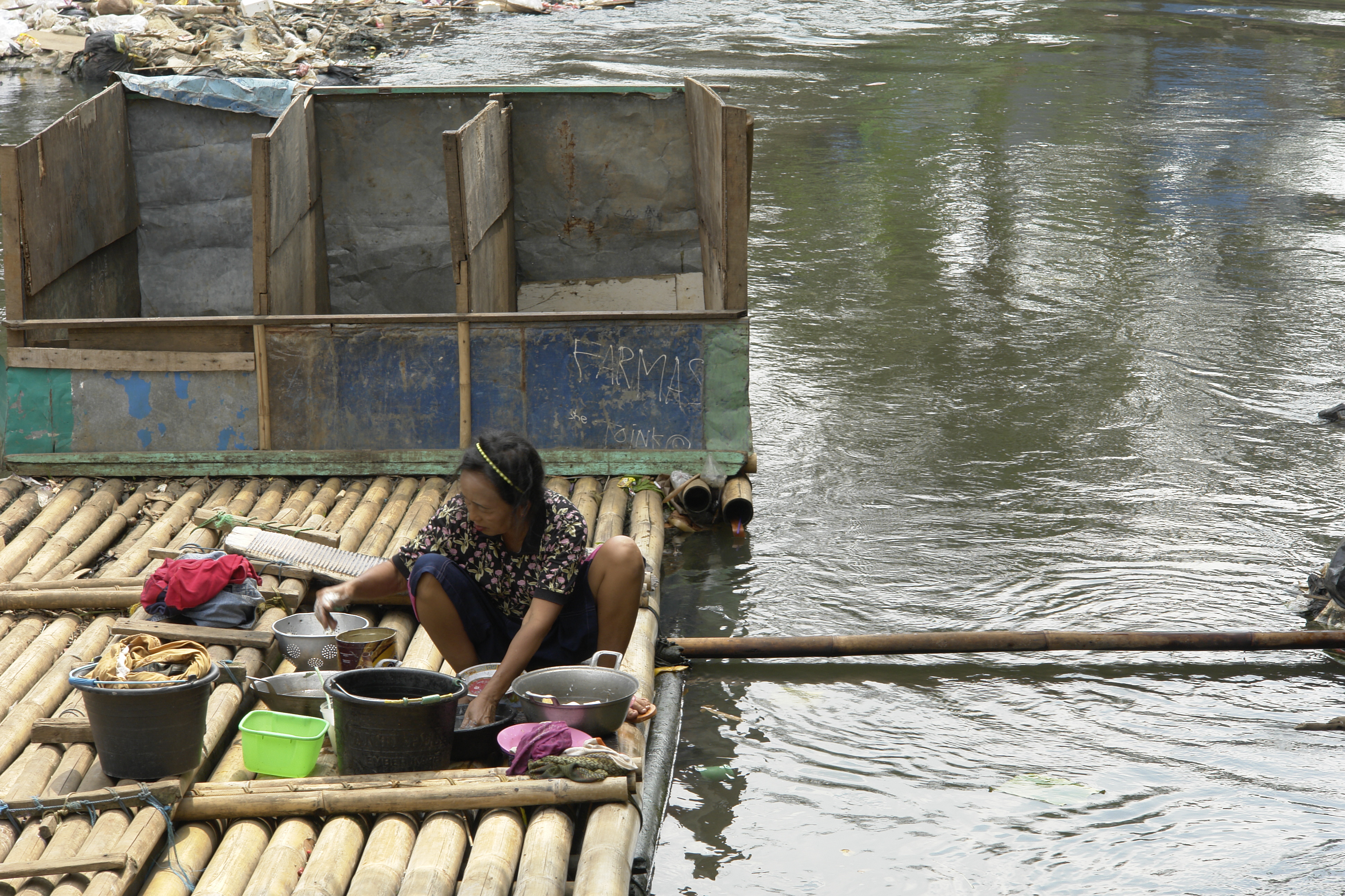 Lavando platos en el río Ciliwung, Yakarta, Indonesia