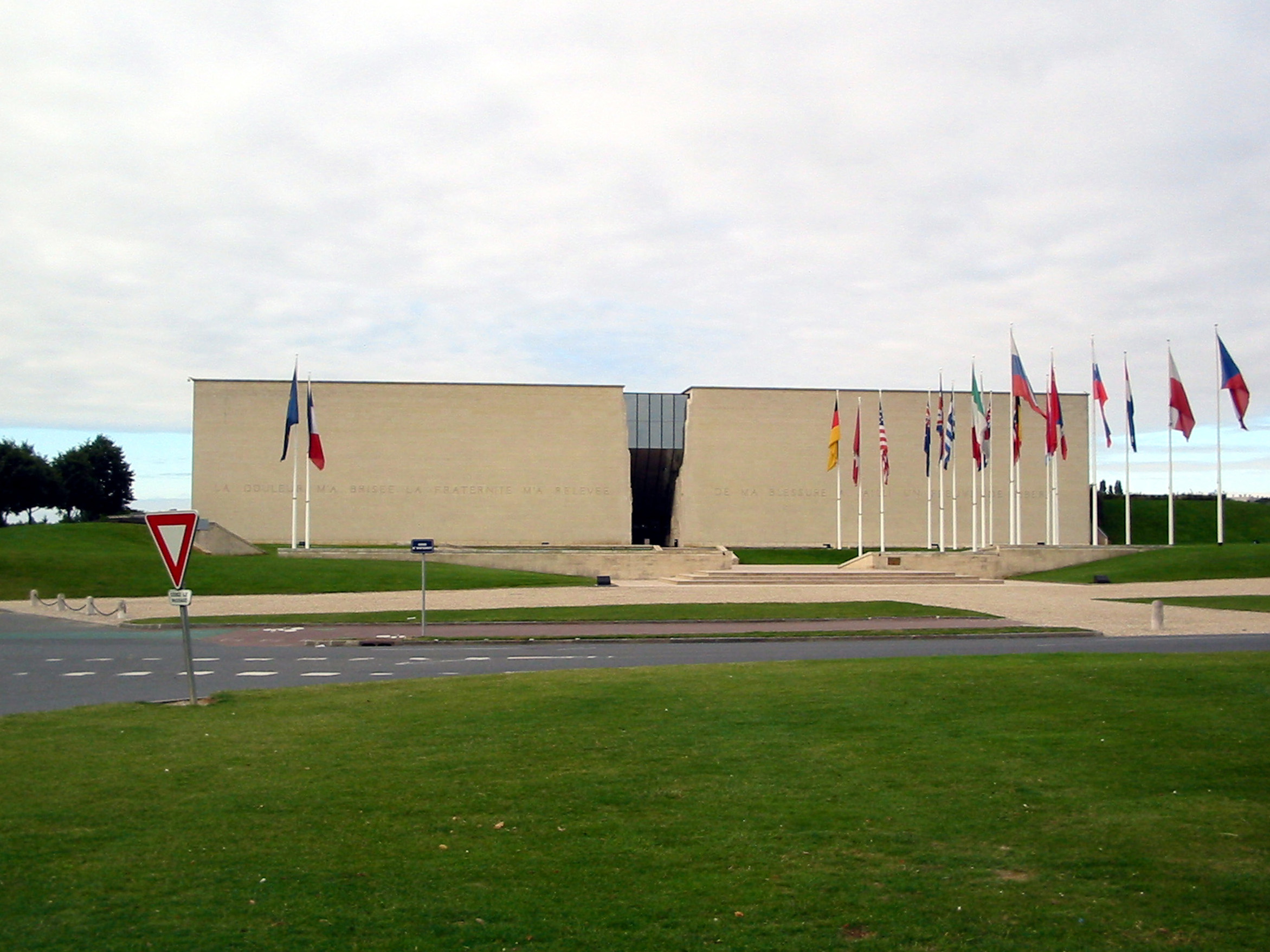 Entrada del Museo memorial de Caen junto con las banderas de los países participantes en la Segunda Guerra Mundial.