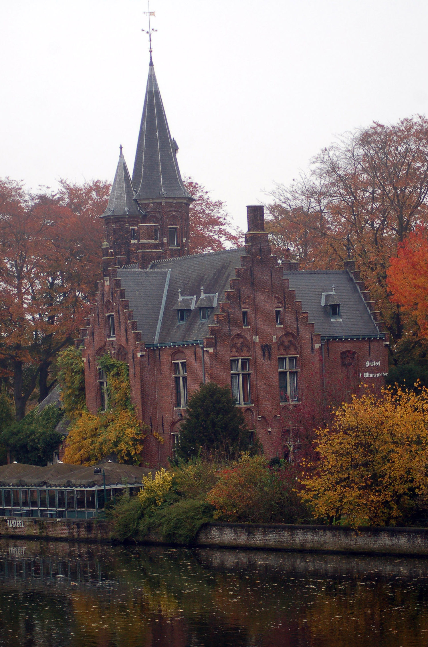 Fachada del Castillo de La Faille y lago Minnewater en Brujas, Bélgica.