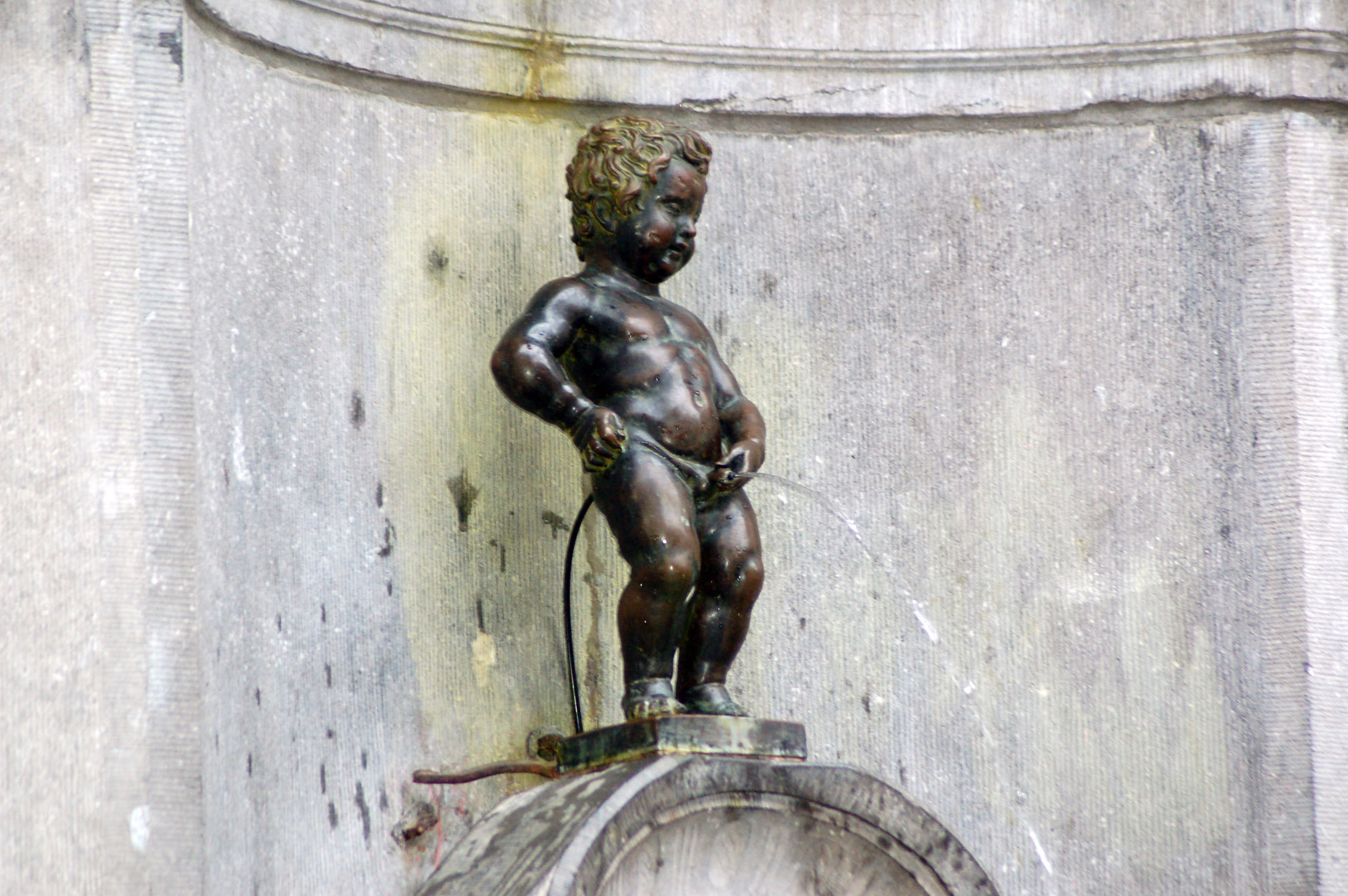 Fuente Manneken Pis en Bruselas, Belgica. Es una estatuilla de unos 50 centímetros que representa a un niño desnudo orinando en la pila de una fuente.