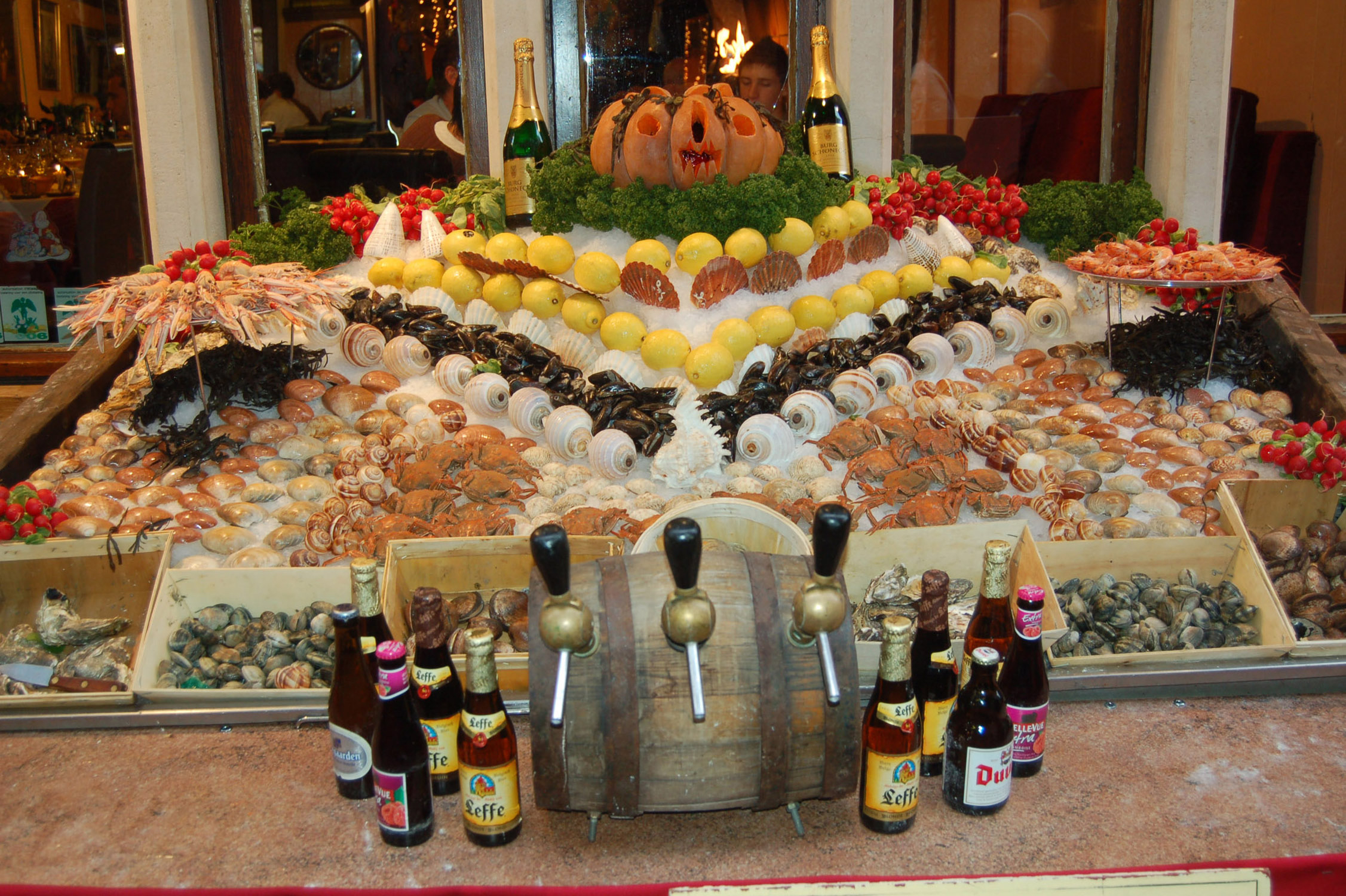Puesto de mariscos y cervezas en el mercado de Bruselas, Bélgica.