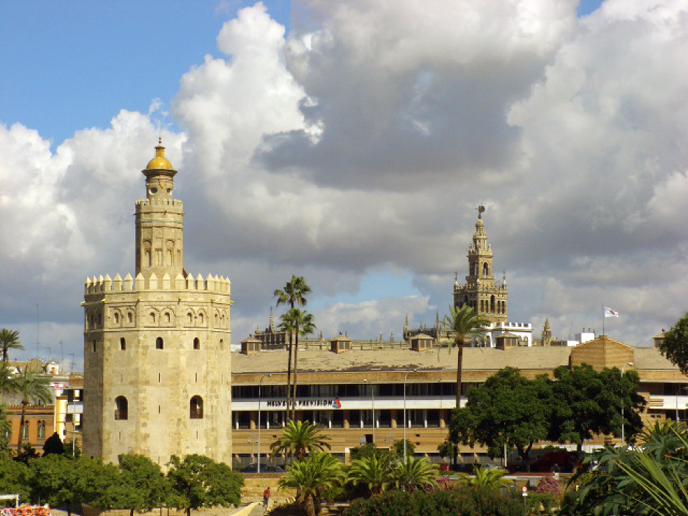 Vista de la Torre del Oro desde el Guadalquivir y al fondo la Giralda de Sevilla.