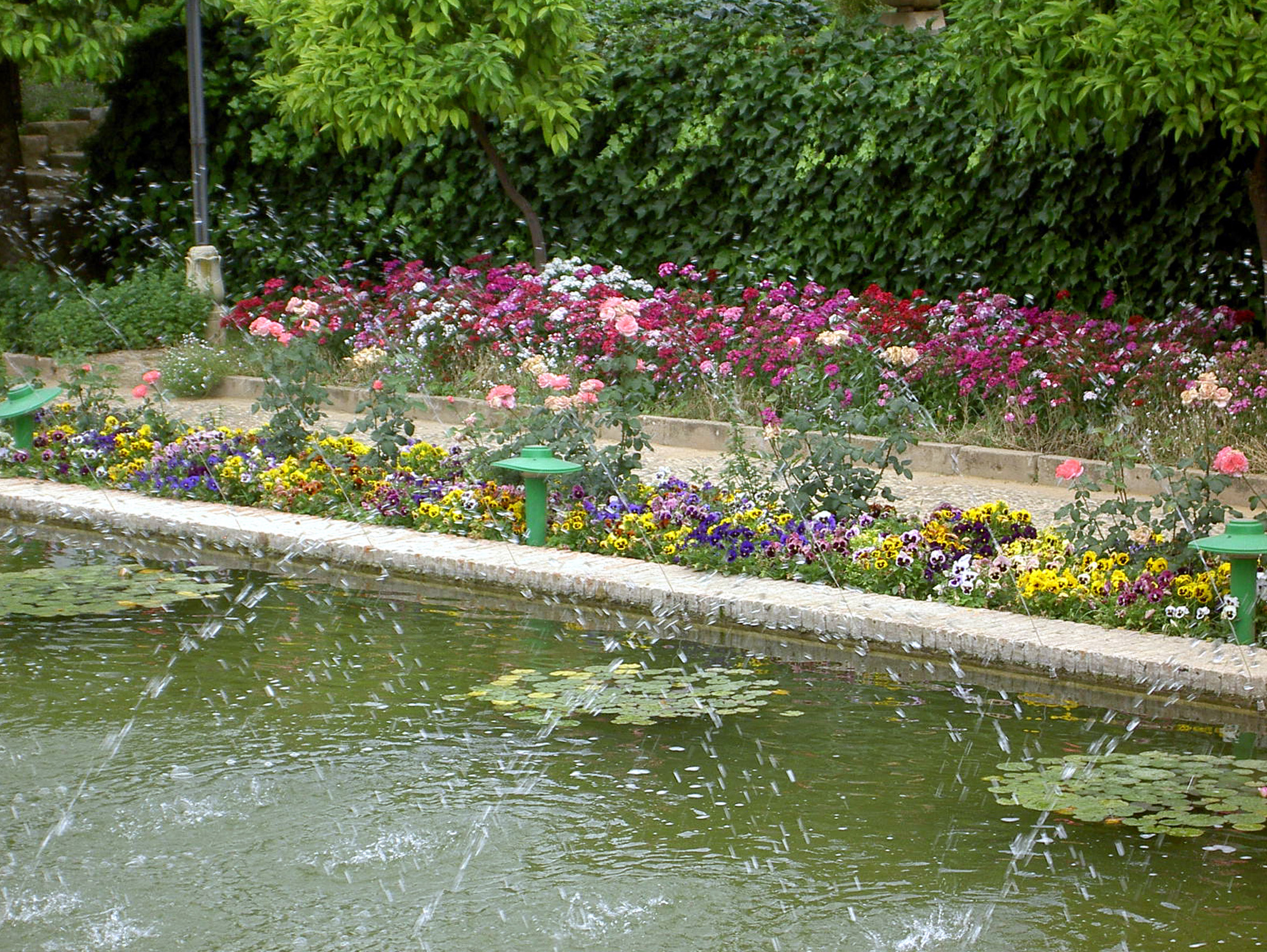 Fuente y plantas en Jardines del Alcázar de los Reyes Cristianos de Córdoba.