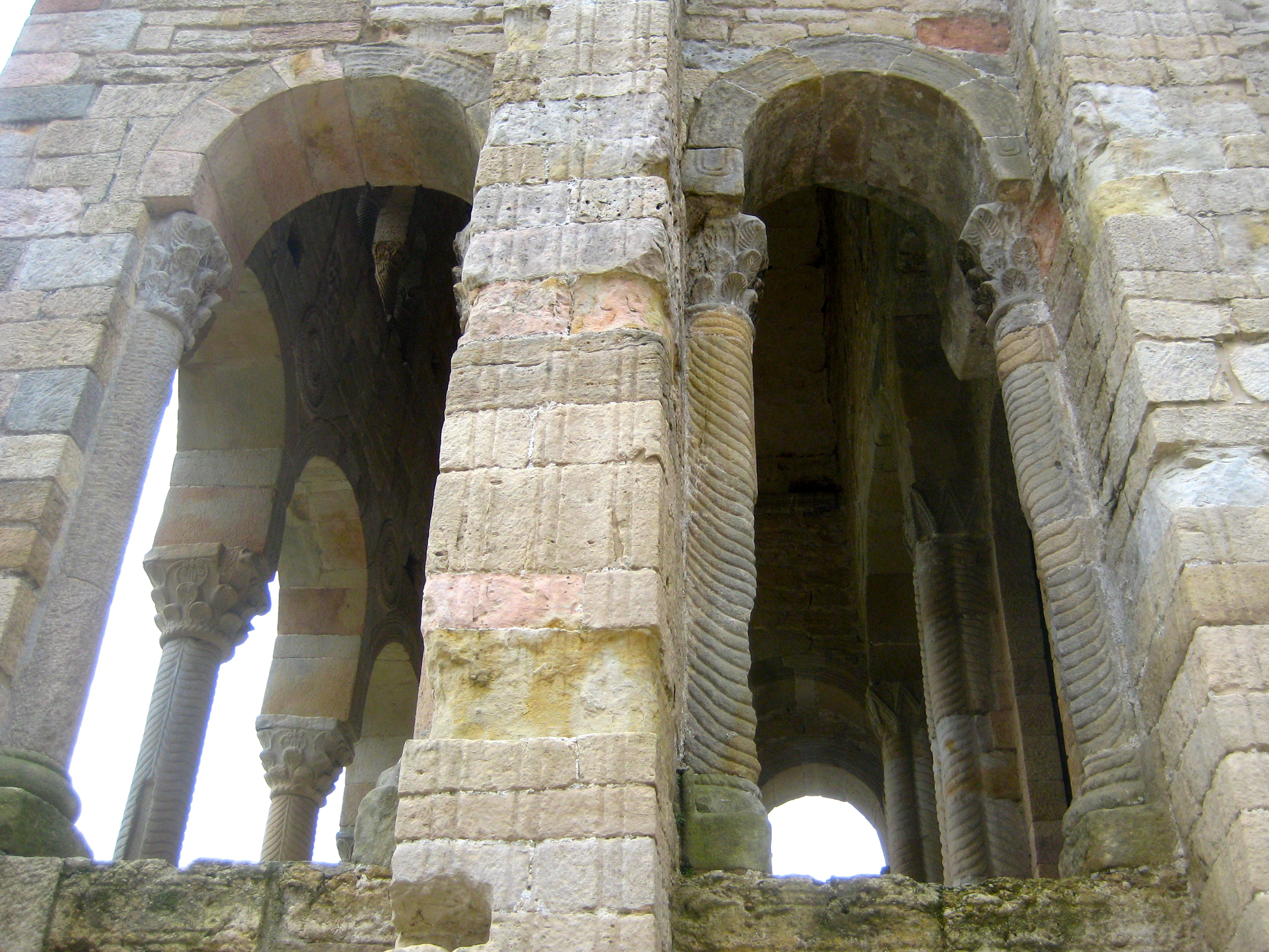 Detalle de la fachada de la Iglesia de Santa María del Naranco en Oviedo. Vista de vanos del piso superior.