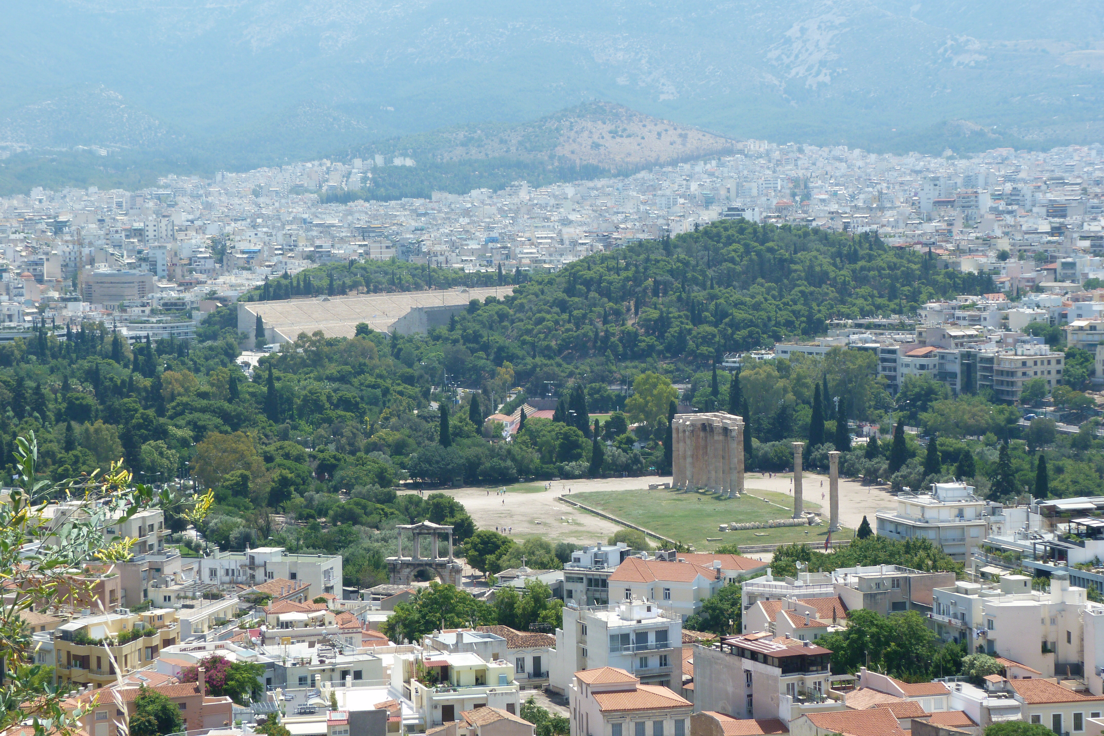 Vista del estadio Panathinaikó y el templo de Zeus desde la Acrópolis de Atenas.