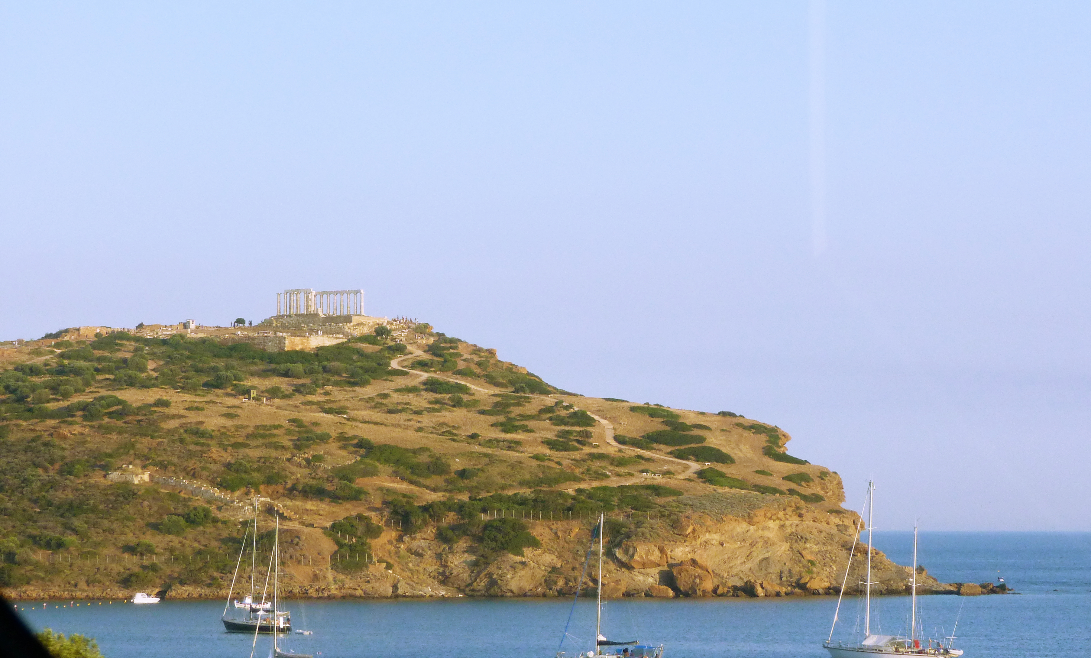 Vistas del Cabo Sunio con barcos y el templo de poseidón