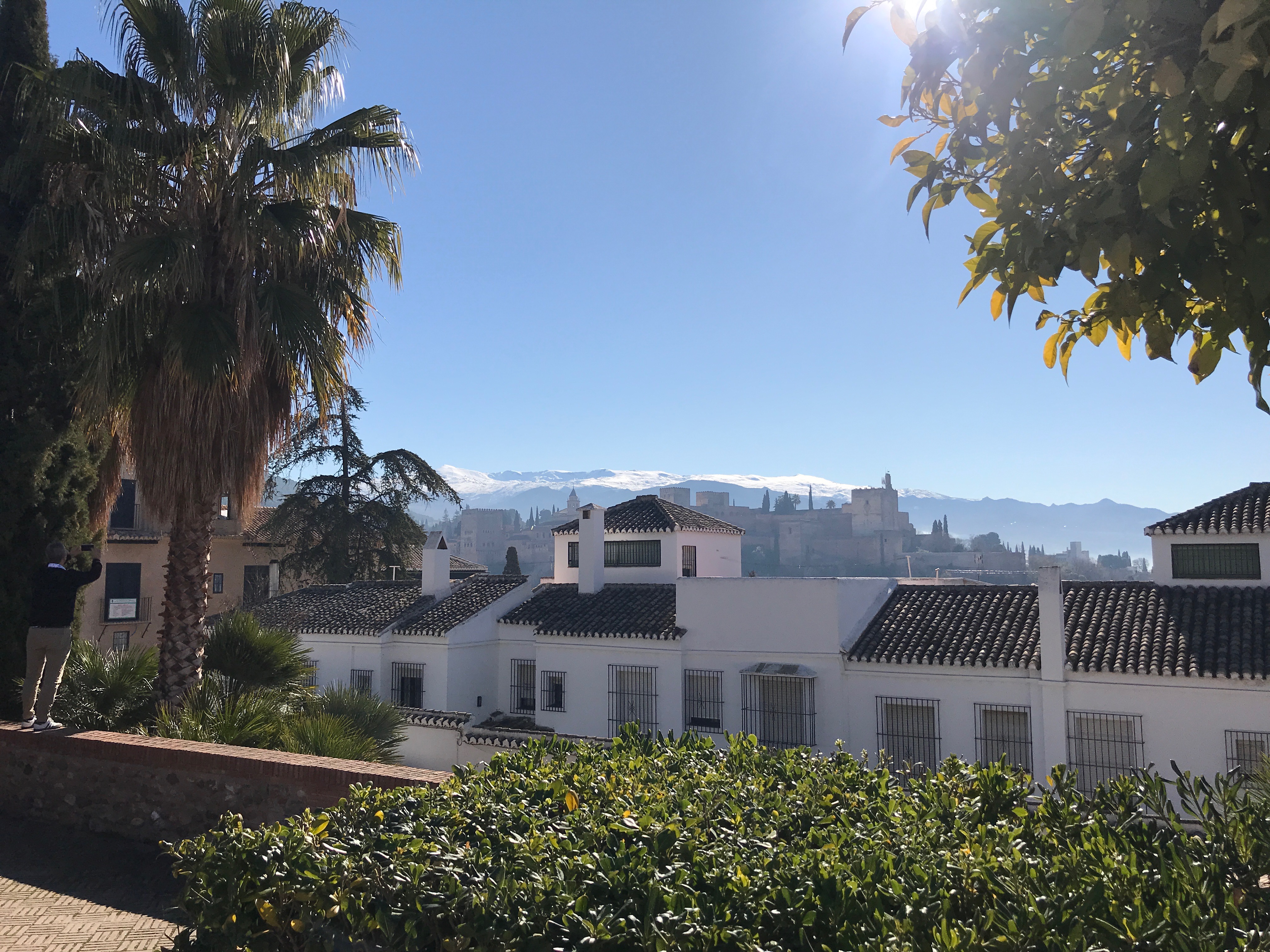 La Alhambra y Sierra Nevada de Granada tras casas blancas.