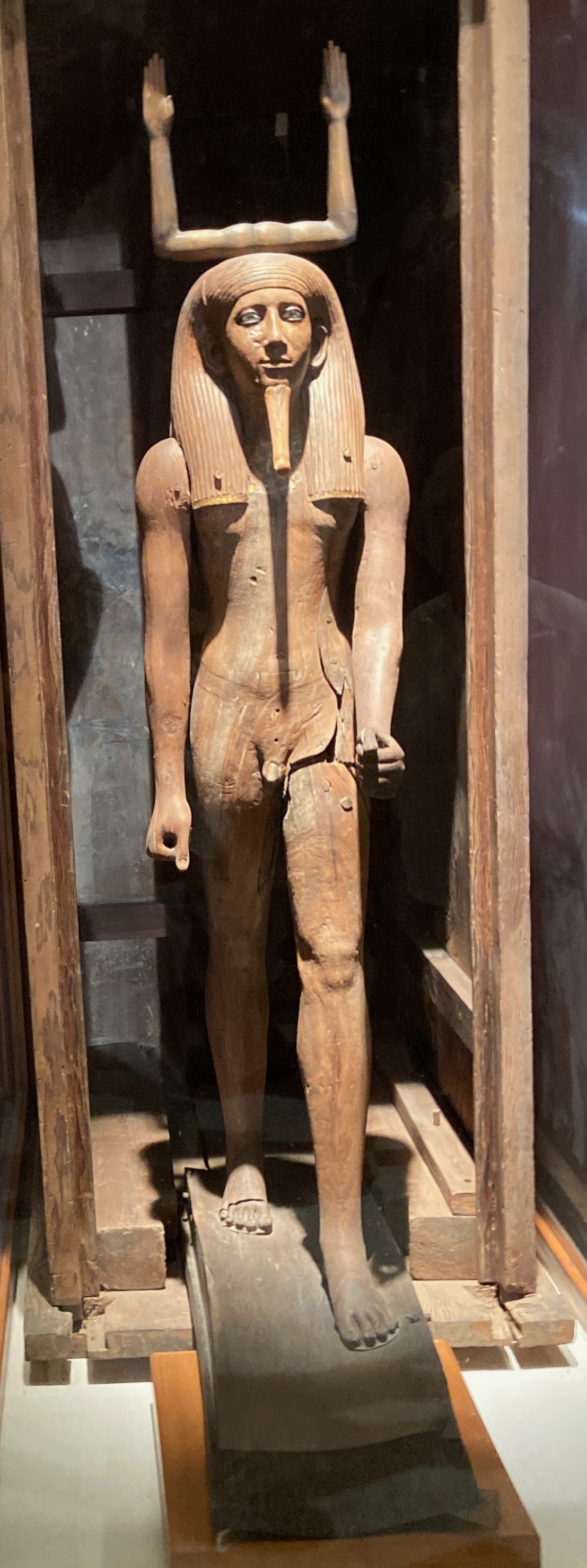 ​ La propia estatua mide 1,35 m de alto. Con el pedestal y el símbolo ka en la cabeza, mide 1,70 m de alto. La estatua está hecha de madera, originalmente cubierta con una capa delgada de estuco hoy desaparecida. El rey parece desnudo pero hay rastros en la madera, pertenecientes a un cinturón pintado, lo que indica que la estatua probablemente también incluiría el tradicional paño blanco. Alrededor del cuello del rey es más visible el también habitual collar ancho. La estatua originalmente sostenía el bastón y el cetro. En la cabeza porta hoy el símbolo jeroglífico del Ka.