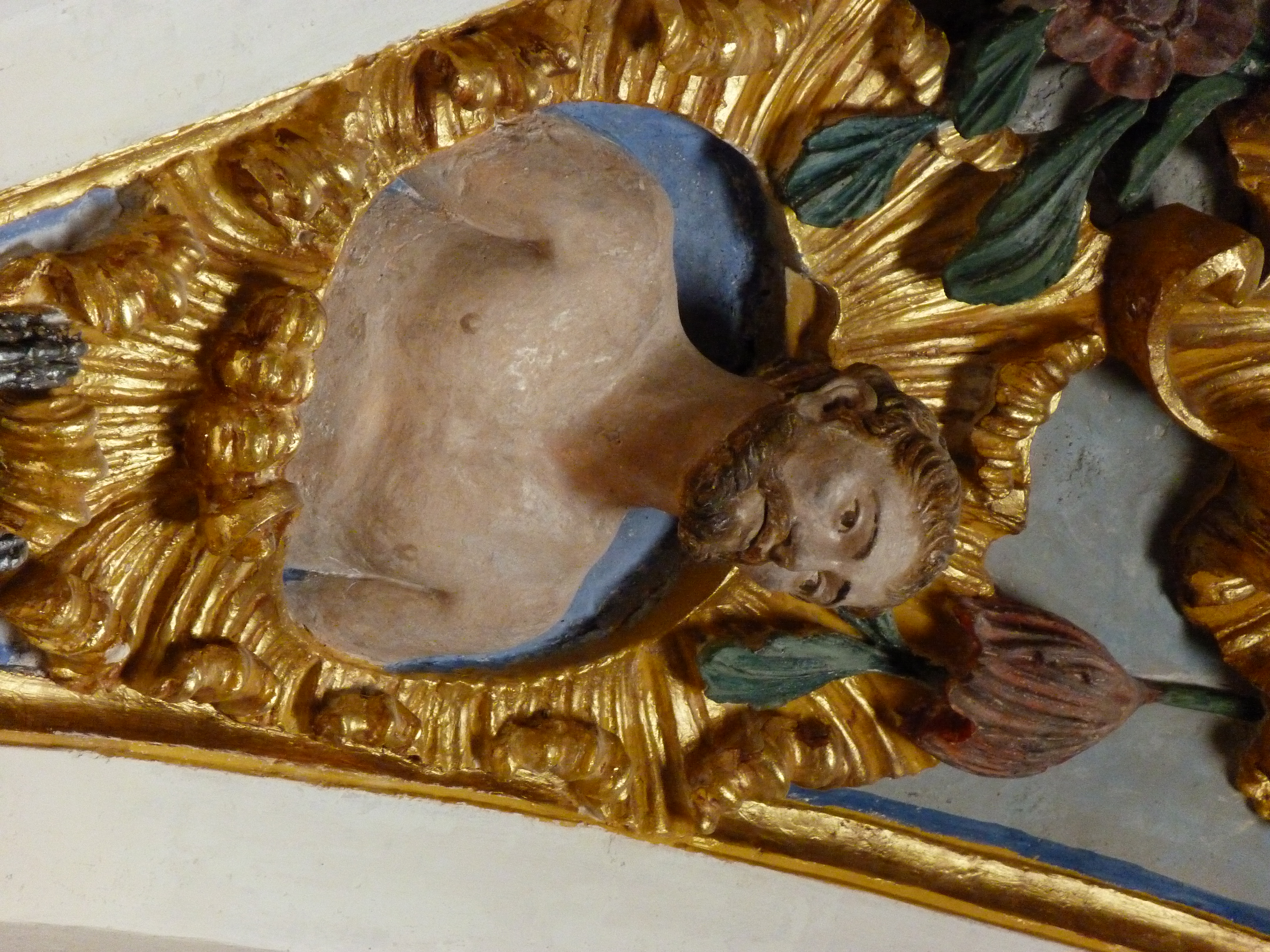 Figura sobre pechina de la bóveda barroca de la catedral de Burgos. Pechina, en arquitectura, es cada uno de los elementos estructurales y constructivos que resuelve el encuentro entre la base circular de una cúpula y un espacio inferior de planta cuadrada.