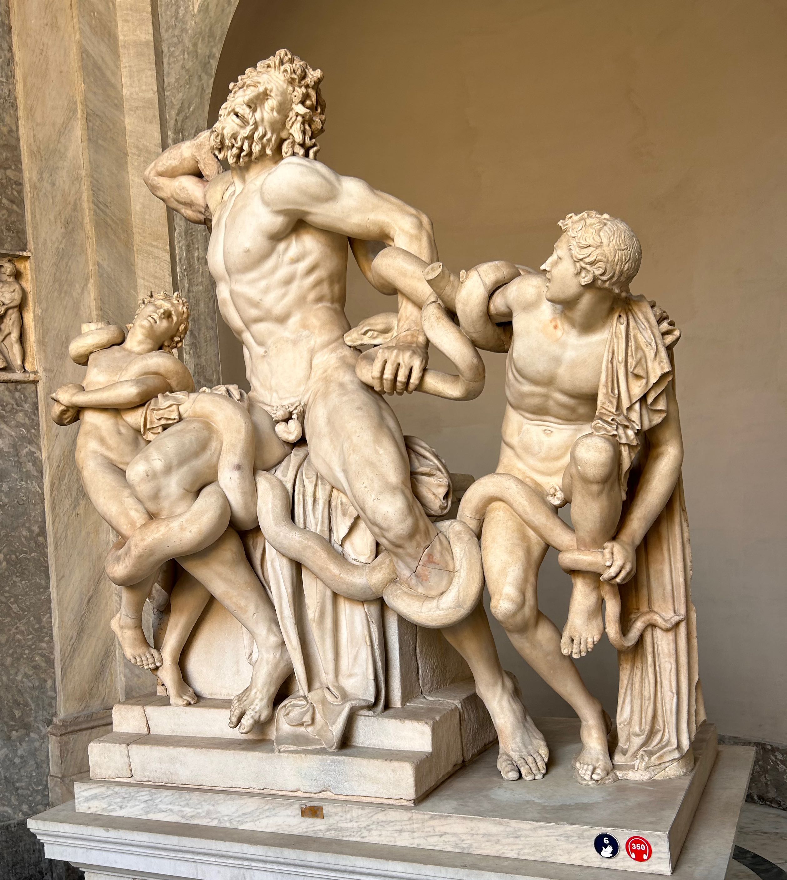 Laocoonte y sus hijos es una obra de mayor al tamaño natural 2,42m de altura y ejecutada en mármol blanco. La agonía se transmite a través de las expresiones contorsionadas de los rostros. La obra se atribuye a tres escultores griegos de la isla de Rodas: Agesandro, Polidoro y Atenodoro de Rodas.