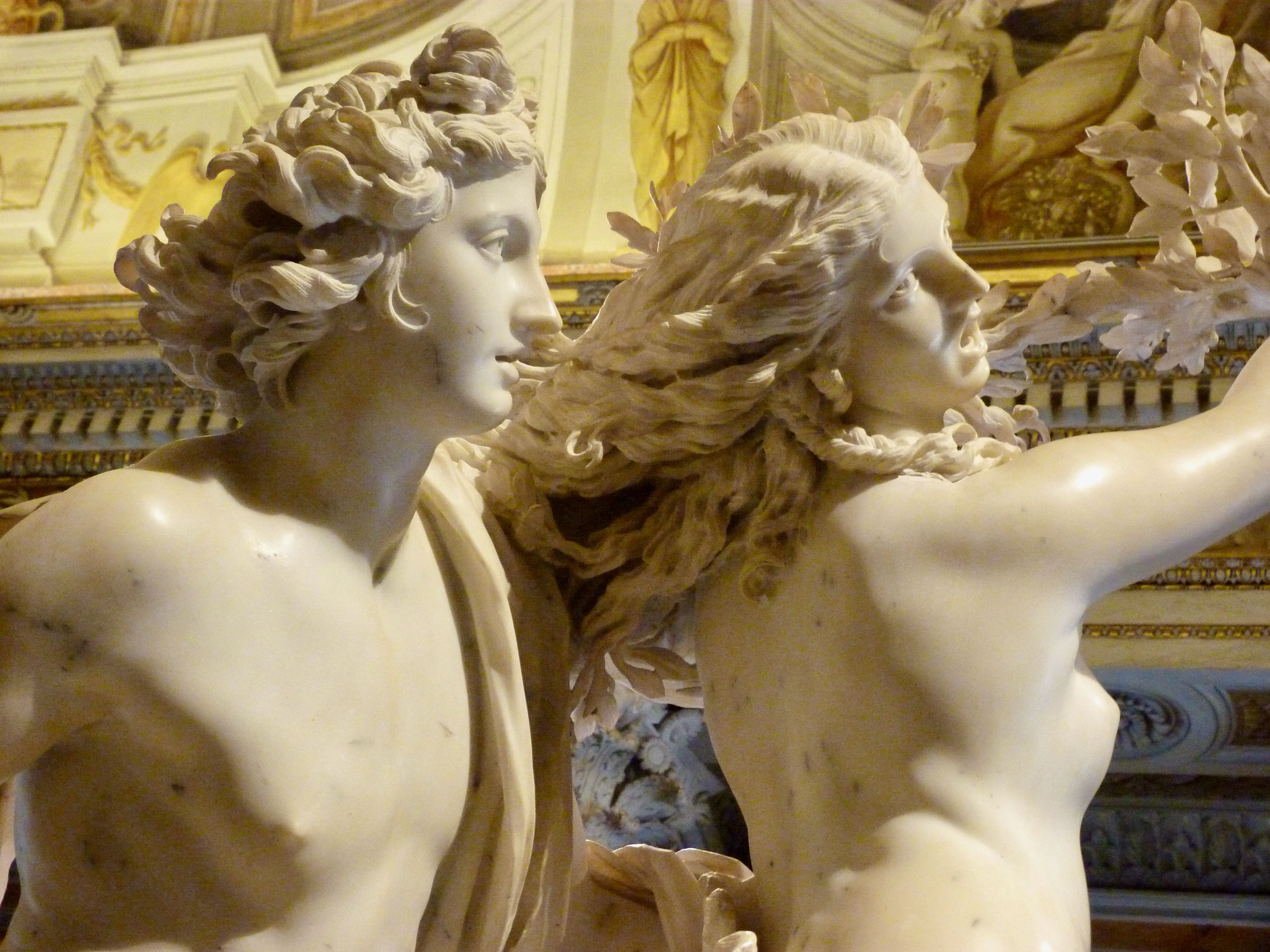 Grupo escultórico Apolo y Dafne de Gian Lorenzo Bernini en la galería Borghese. En ella se puede advertir a Apolo alcanzando a Dafne mientras ella intenta escapar. Apolo está coronado con una corona de laurel que presagia la metamorfosis de Dafne en árbol de laurel. Dafne es retratada durante el proceso de transformación, de hecho sus brazos están tomando la forma de ramas mientras huye e implora a su padre que la rescate de Apolo.