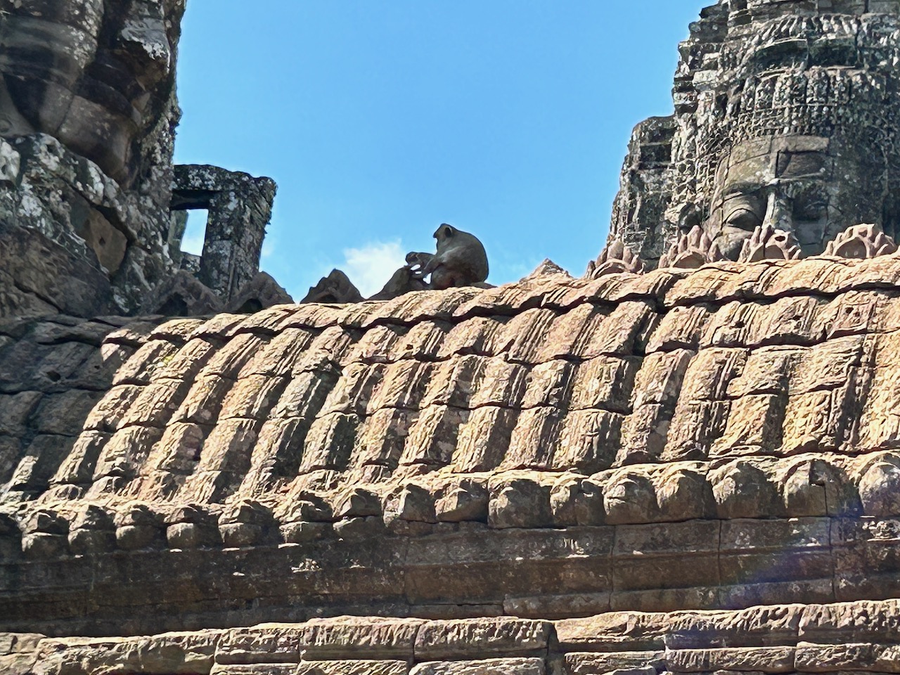 Construido a finales del siglo XII o principios del XIII como el hipnótico templo estatal del rey budista Mahayana Jayavarman VII. Se dice que es la personificación del genio creativo y del ego superlativo del rey mas famoso de Camboya. Sus 54 torres de aspecto gótico están decoradas con 216 caras sonrientes de proporciones colosales que representan a Avalokiteshvara y están adornadas con 1'2km de extraordinarios bajorrelieves con mas de 1000 figuras. En la imagen. uno de los monos que deambulan libremente por él.