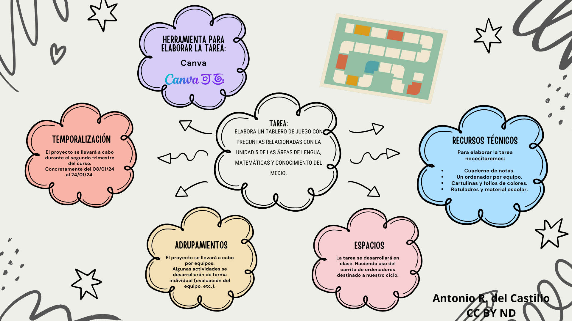 El presente proyecto pretende que el alumnado de tercero de EP elabore un tablero de juego con preguntas relacionadas con la unidad 5 de las áreas de Lengua, Matemáticas y Conocimiento del Medio. Para ello, utilizarán una plantilla de Canva y establecerán una serie de reglas. Finalmente, podrán compartir sus tableros con el resto de equipos y contestarán las preguntas planteadas.